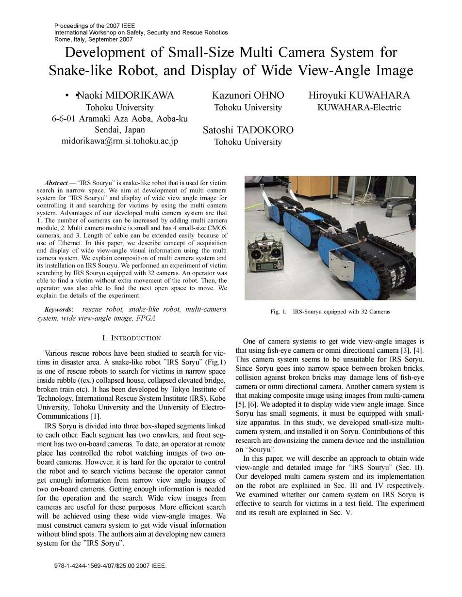 其中一个相机系统通过鱼眼或者全向照相机获得广视角图像。这个相机系统好像不适用于“IRS Souryu”。自从Soiyu进入破碎的砖块、碰撞破碎的砖块的狭窄的空间可能破坏鱼眼相机或者全向相机。另一个相机系统用多个相机的图像合成的图像。我们采用它显示广视角图像。自从Soiyu有小的部分,它必须装配小尺寸的仪器。在本研究中,我们开发了小尺寸多相机系统,并安装在Soiyu上面。本研究的贡献在于缩小了相机设备并安装在“IRS Souryu”上面。
