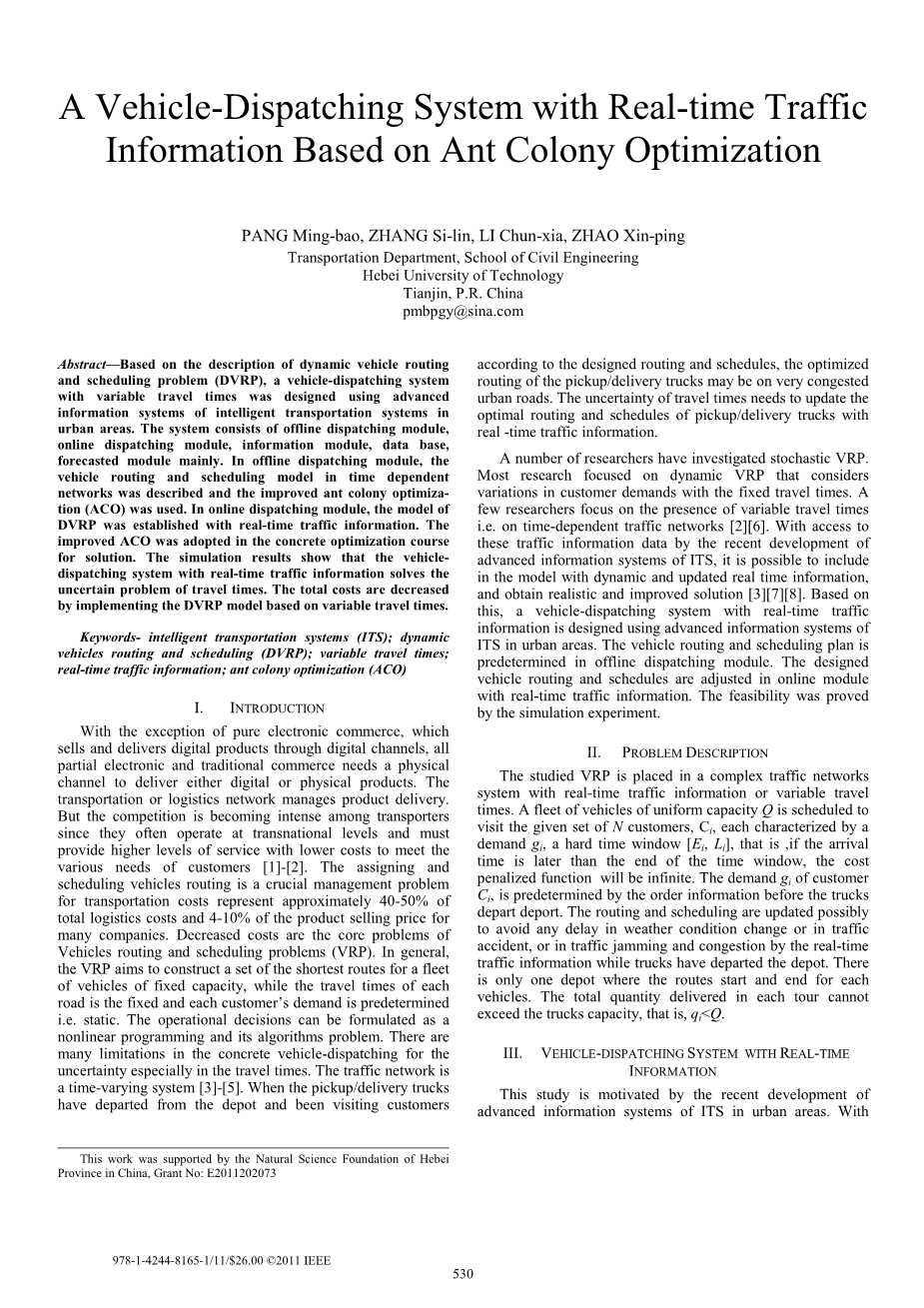 关键词:智能交通系统,动态车辆调度(DVRP),可变的旅行时间,实时交通信息,蚁群优化(ACO)