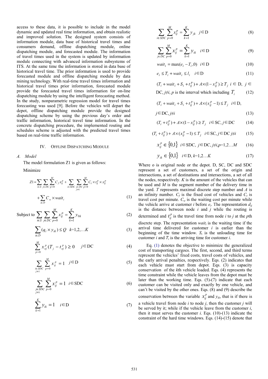 在卡车离开仓库,离线调度模块提供了有计划的调度方案前一天的秩序和交通信息,历史行程时间信息。在具体的调度程序,实施的路由和时间表的调整基于实时交通信息的出行时间预测。该模型可以给出配方Z2: