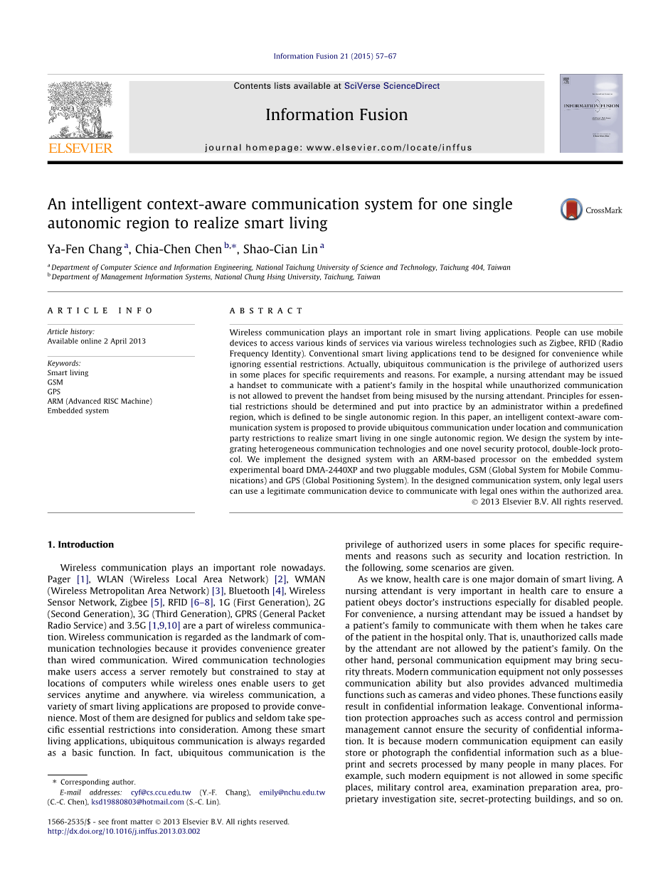 无线通信在当今起着重要的作用。寻呼机[1],WLAN(无线局域网)[2],WMAN(无线城域网)[3],蓝牙[4],无线传感器网络,ZigBee[5],RFID[6–8],1G(第一代),2G(第二代),3G(第三代),GPRS(通用分组无线业务)和3.5G[1,9,10]是无线通信的一部分。无线通信被认为是通信技术的标志,因为它比有线通信更便利。有线通信技术使用户远程访问服务器,但限制留在计算机上,而无线的用户可以随时随地获得服务。通过无线通信,为各种智能生活应用提供了方便。他们中的大多数被设计为公众使用但很少考虑采取特定的基本限制。在这些智能生活的应用中,无处不在的通信一直被视为一个基本的功能。事实上,无处不在的通信是在某些特定的要求和理由下,如安全性和位置限制的用户的特权。在下面,给出了一些场景。