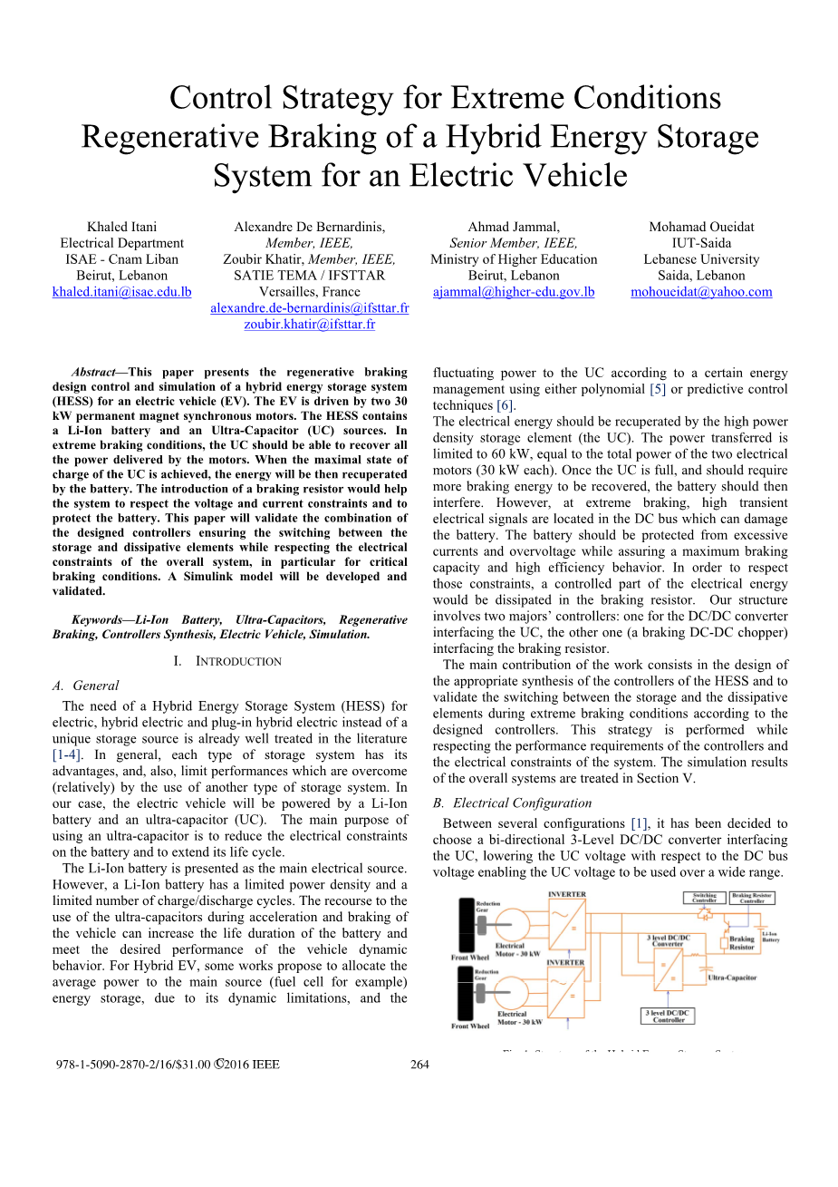 极端工况下电动汽车混合动力储存系统的再生制动的控制方法外文翻译资料