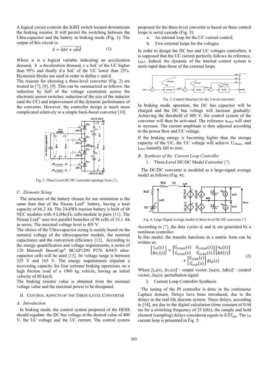 在制动模式下,所提出的HESS的控制系统应该调节:DC总线电压在期望值400V,UC的电压和UC的电流。 控制系统提出的三电平转换器是基于串联级联的三个控制环(图3):