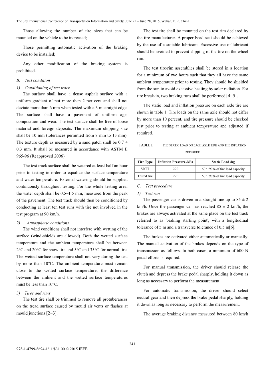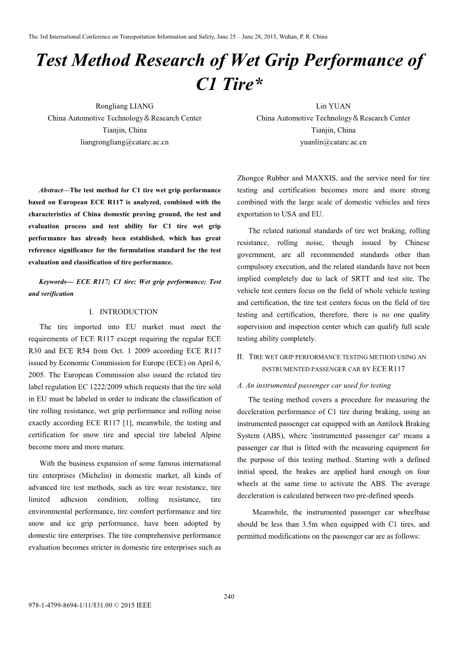 摘要 - 分析了基于欧洲ECE R117的C1轮胎湿抓地性能试验方法,结合中国国内试验场的特点,已经建立了C1轮胎湿抓地性能的试验和评价过程及试验能力, 对轮胎性能测试评估和分类的标准有很大的参考意义。