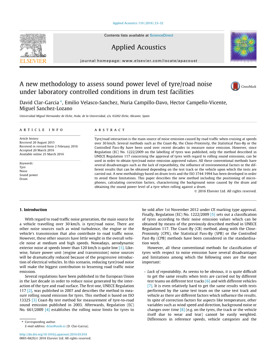 当时速超过30公里每小时的时候,轮胎跟道路的摩擦是道路交通的噪声辐射的主要来源。近几十年来已经使用好几种方法来测量噪声发射,诸如惯性,近似统计传递或受控传递。然而,由于公布了关于轮胎标签的第1222/2009号条例,只能使用UNECE第117条中关于滚动噪声排放的轮胎审批中描述的方法,以获得轮胎/道路噪声排放许可值。这些常规方法具有一些缺点,例如缺乏重复性,环境因素的影响或取决于测试轨道或进行测试的车辆可获得的不同结果。已经开发了基于鼓试验和ISO 3744:1994的新方法,以避免这些限制。本文介绍了新的方法,包括麦克风的定位,计算校正因子,表征由转鼓引起的背景噪声,并测定轮胎在滚筒上滚动时的声功率水平。