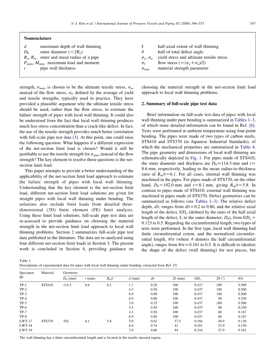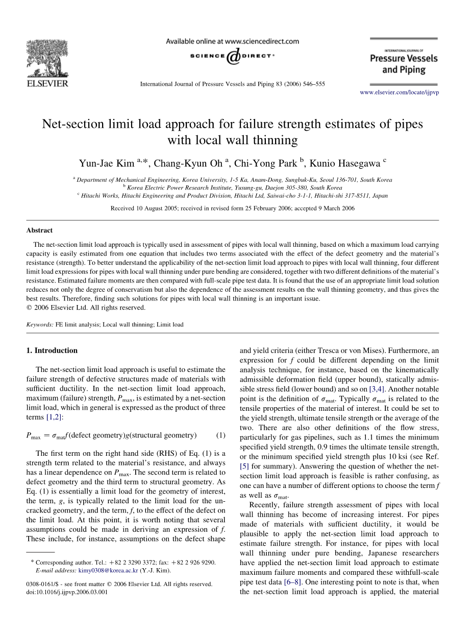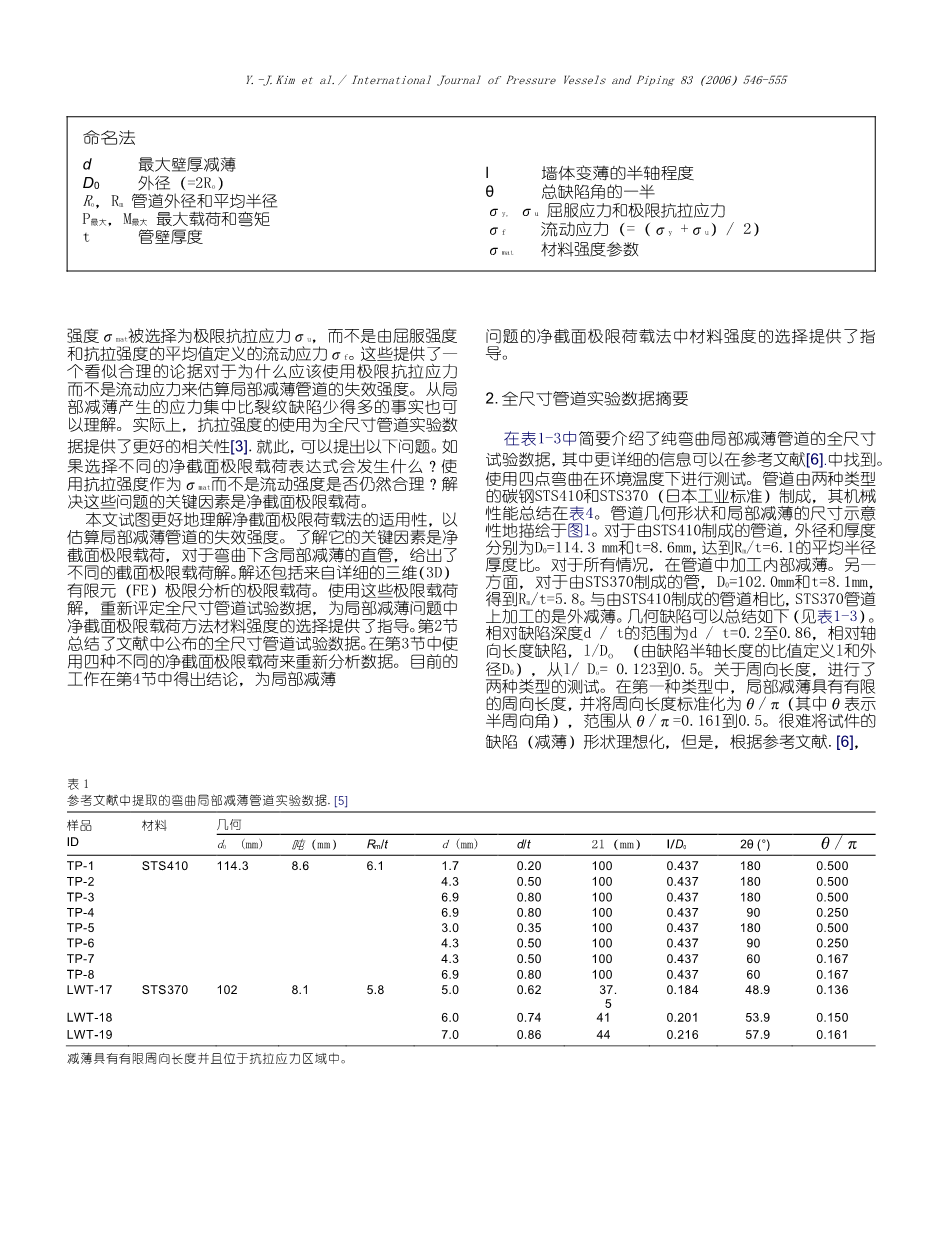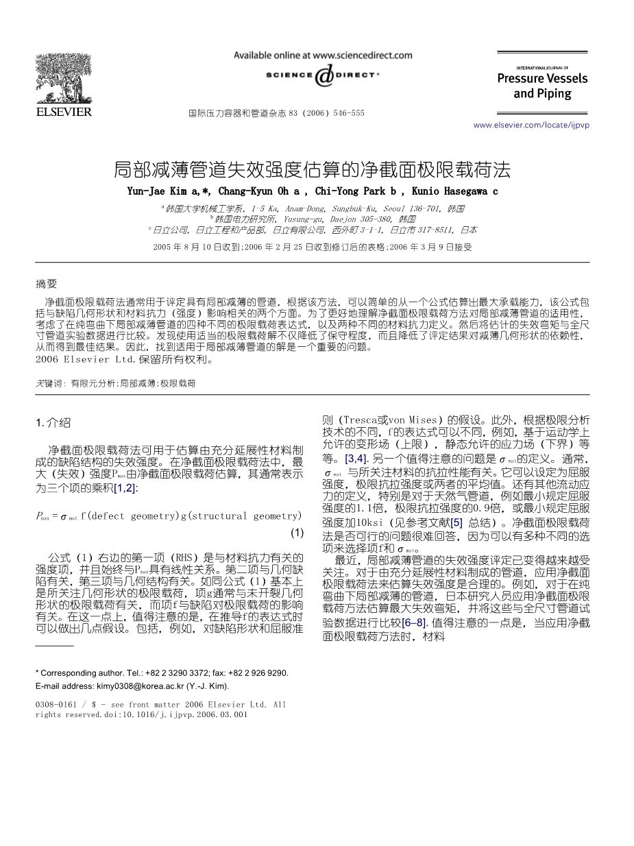 局部减薄管道失效强度估算的净截面极限载荷法外文翻译资料
