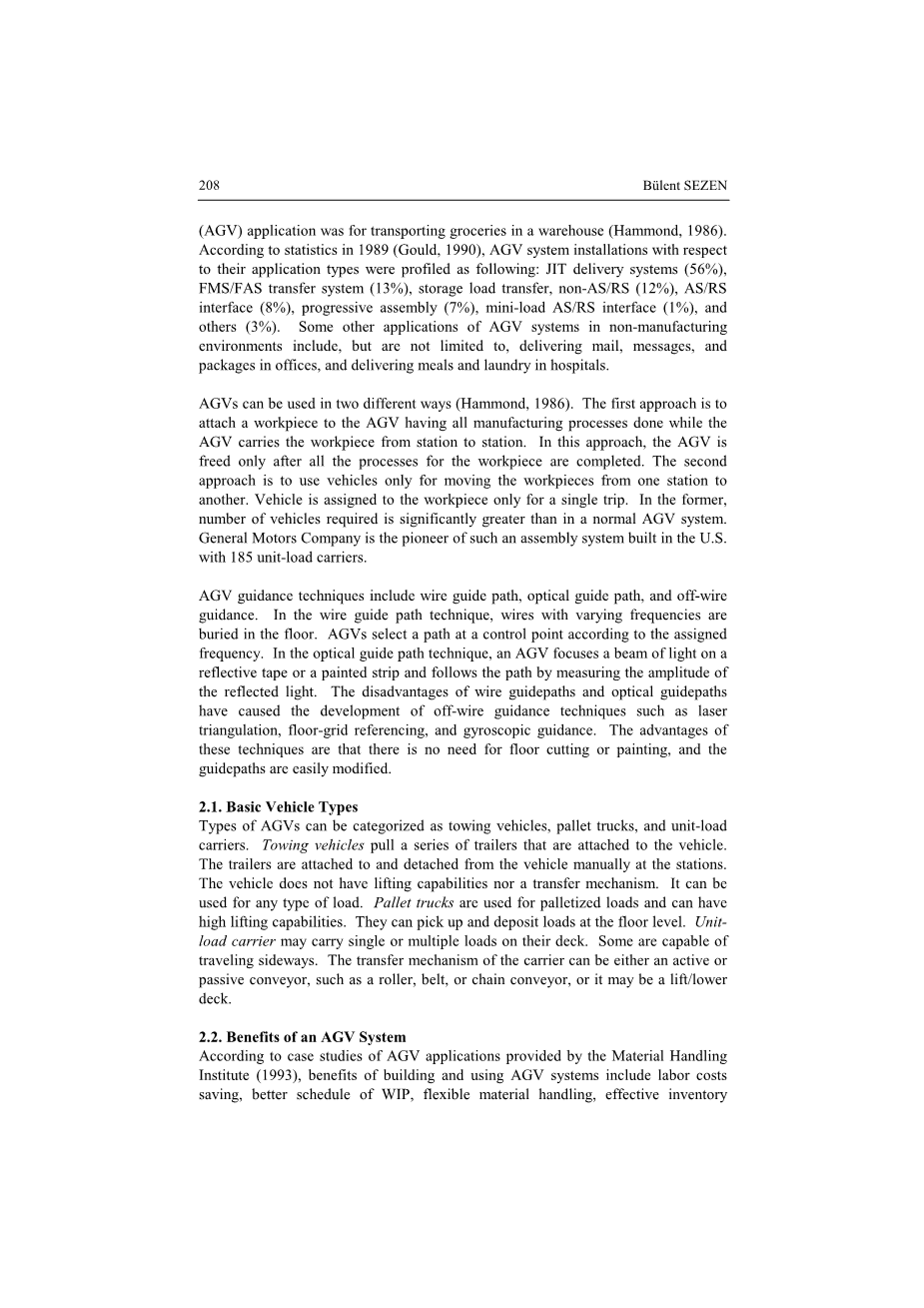 随着自动化机器技术的提升,制造系统中的处理物料变得越来越容易。当今快速发展的技术为制造企业提供了许多替代厂内运输的方案。自动引导车辆(AGV)系统就是一种先进的物料处理系统,它包括了一组无人驾驶车辆(AGV),这些车辆遵循引导路径并由计算机控制(Hammond,1986)。本研究的目的是(1)提供有关AGV系统在制造环境中使用的信息。(2)回顾关于AGV系统设计、建模和仿真的文献。