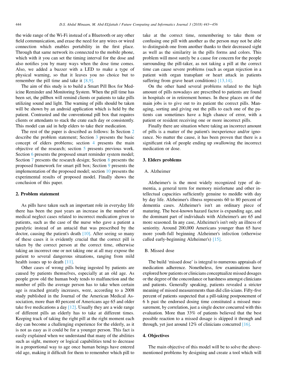 本文的其余部分描述如下:第二节描述了问题陈述;第三节提出了老年人问题的基本概念;第四节提出了研究的主要目标;第五节介绍了过去的研究工作。第六节介绍了所提出的智能提醒系统模型;第七节介绍了研究设计;第八节提出了智能药盒的建议框架;第九节介绍了该模型的实现;第十节给出了该模型的实验结果。最后部分将给出本文的结论。
