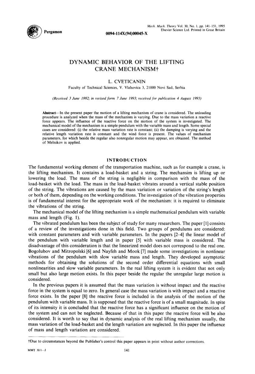 摘要——这个文献考虑了起重机起升机构的运动。分析了当机构质量变化时的卸载过程。由于质量变化,一个反作用力出现了。这个反作用力对系统运动的影响是被调查过。这个机械装置的机械模型为变质量变长度单摆。考虑到一些特殊情况:(i)相对质量变化率是恒定的;(ii)阻尼是变化的,相对长度变化率是恒定的,并且存在风力。得到了除规则运动外可能出现非规则运动的机构参数值。使用Melnikov的方法