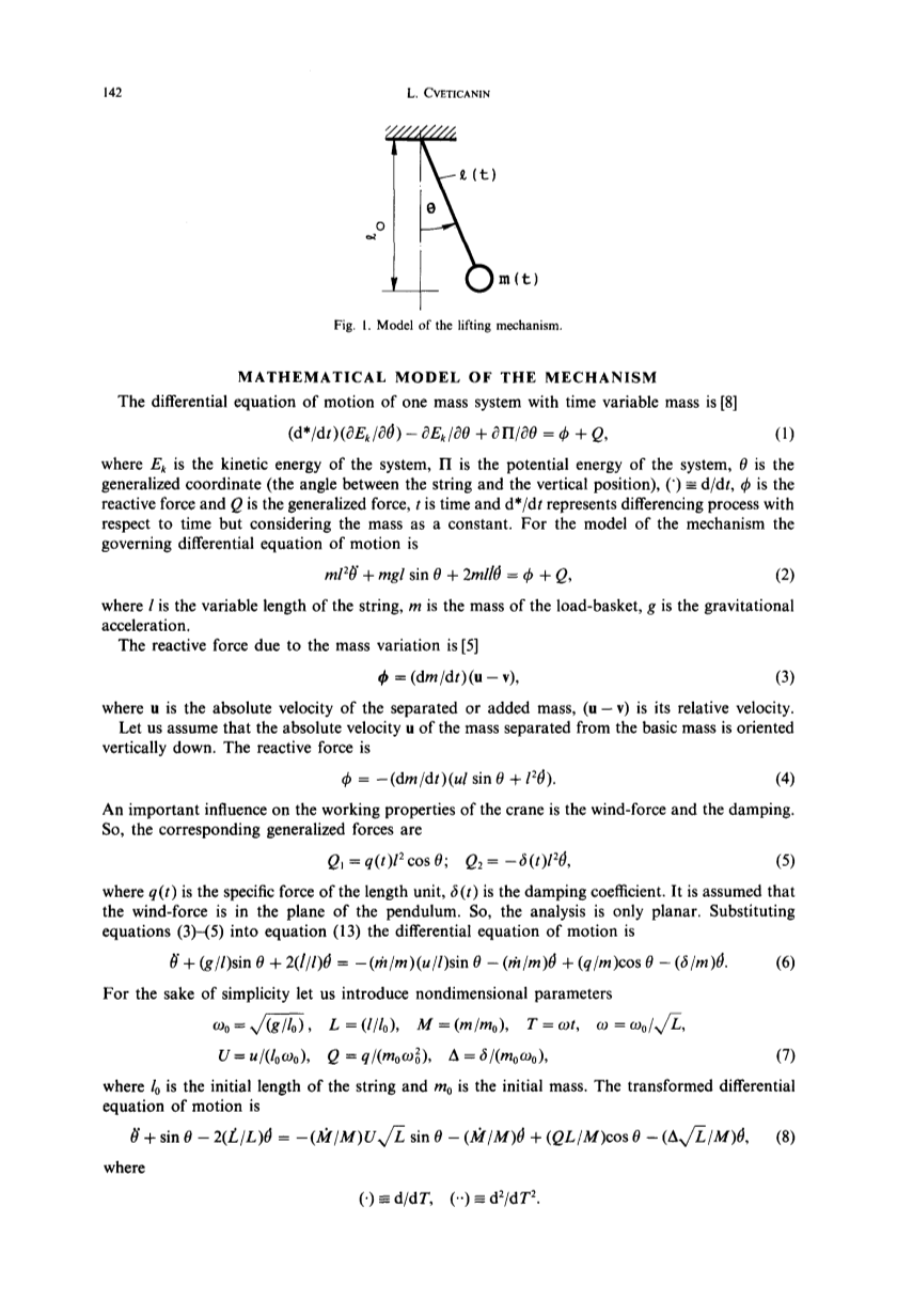 振动摆一直是许多研究者研究的课题。本文[1]回顾了在这一领域进行的调查。考虑了两类摆:定参数摆和变参数摆。文[2-4]考虑变长摆的线性模型,文[5]考虑变质量摆的线性模型。这种考虑的缺点是线性化模型与实际模型不符,Bogolubov和Mitropolski[6]和Nayfeh和Mook[7]对变质量变长度摆的非线性振动进行了研究。他们发展了求二阶微分方程解的渐近方法非线性和慢变量参数。在实际的提升系统中,很明显不仅存在小而大的运动。在这篇文章中,除了规则运动外,不规则的大运动是考虑过的。