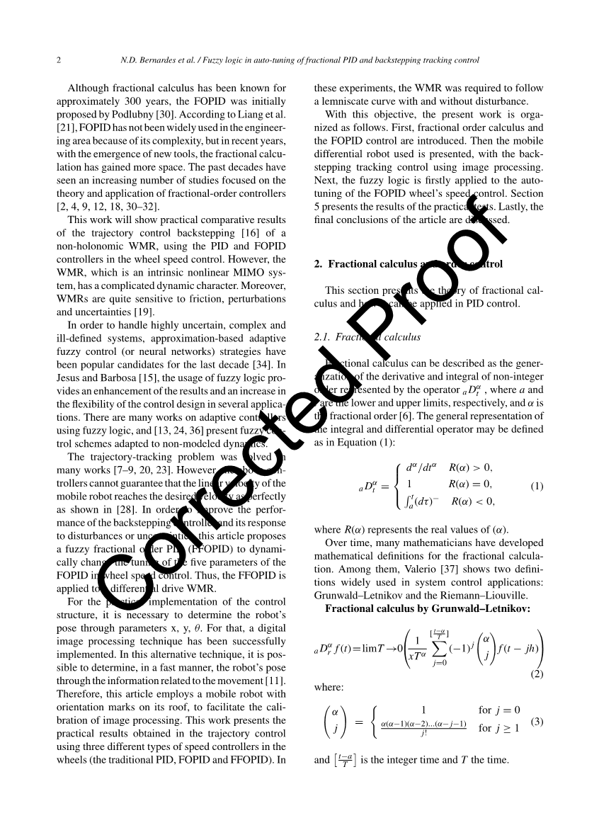 为了这个目标,目前的工作安排如下。首先, 介绍了分数阶微积分和FOPID控件。然后介绍了所使用的移动式差动机器人,以及使用图像处理的反步跟踪控制。接下来,首先将模糊逻辑应用于FOPID车轮速度控制的自动调整。第5节介绍了实际测试的结果。最后,讨论了本文的 最终结论。