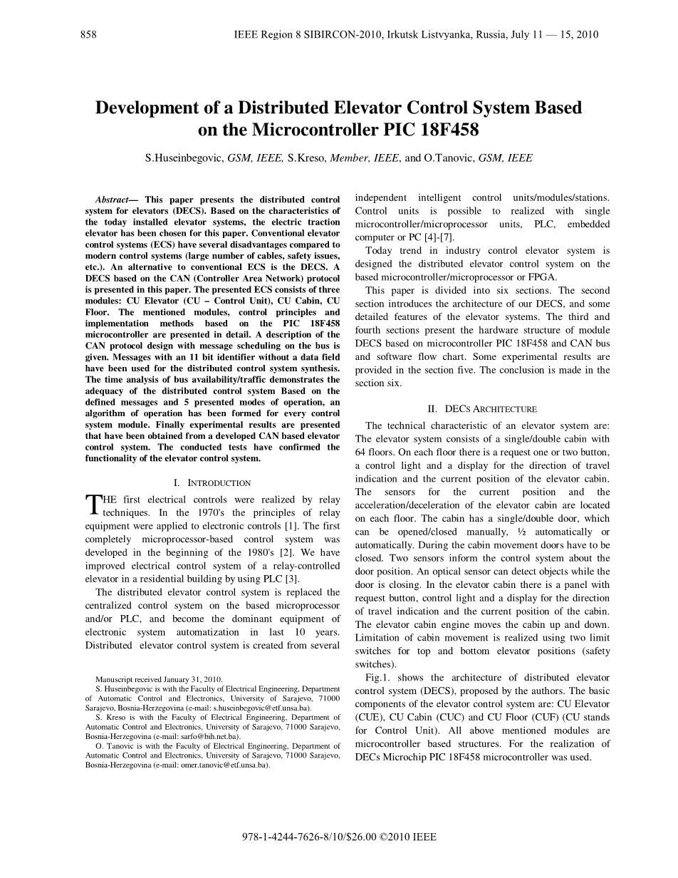 摘录-介绍了电梯分布式控制系统(DECS).本文根据现有电梯系统的特点,选择了电动曳引电梯。与现代控制系统(大量电缆、安全问题等)相比,传统的电梯控制系统(ECS)有几个缺点。传统ECS的另一种选择是DECS。 本文提出了一种基于CAN(控制器区域网络)协议的DECS.所提出的ECS由三个模块组成CU电梯(CU-控制单元),CU舱,CU层.详细介绍了基于PIC18F458单片机的模块、控制原理和实现方法。本文介绍了CAN协议总线上的消息调度