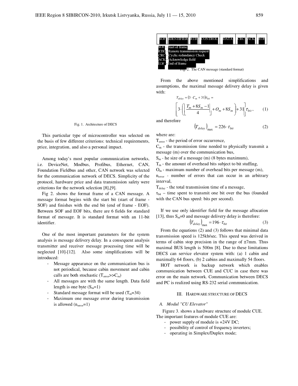 由方程(2)和(3)可知,最小数据传输速度为125kb/s。这种速度是根据机舱停止精度在plusmn;7mm范围内导出的。因此,最大BUS长度为500m[8]。由于这些限制,DECS可以使用电梯系统:(a)1个舱室,最大64层,(b)2个舱室,最多54层。