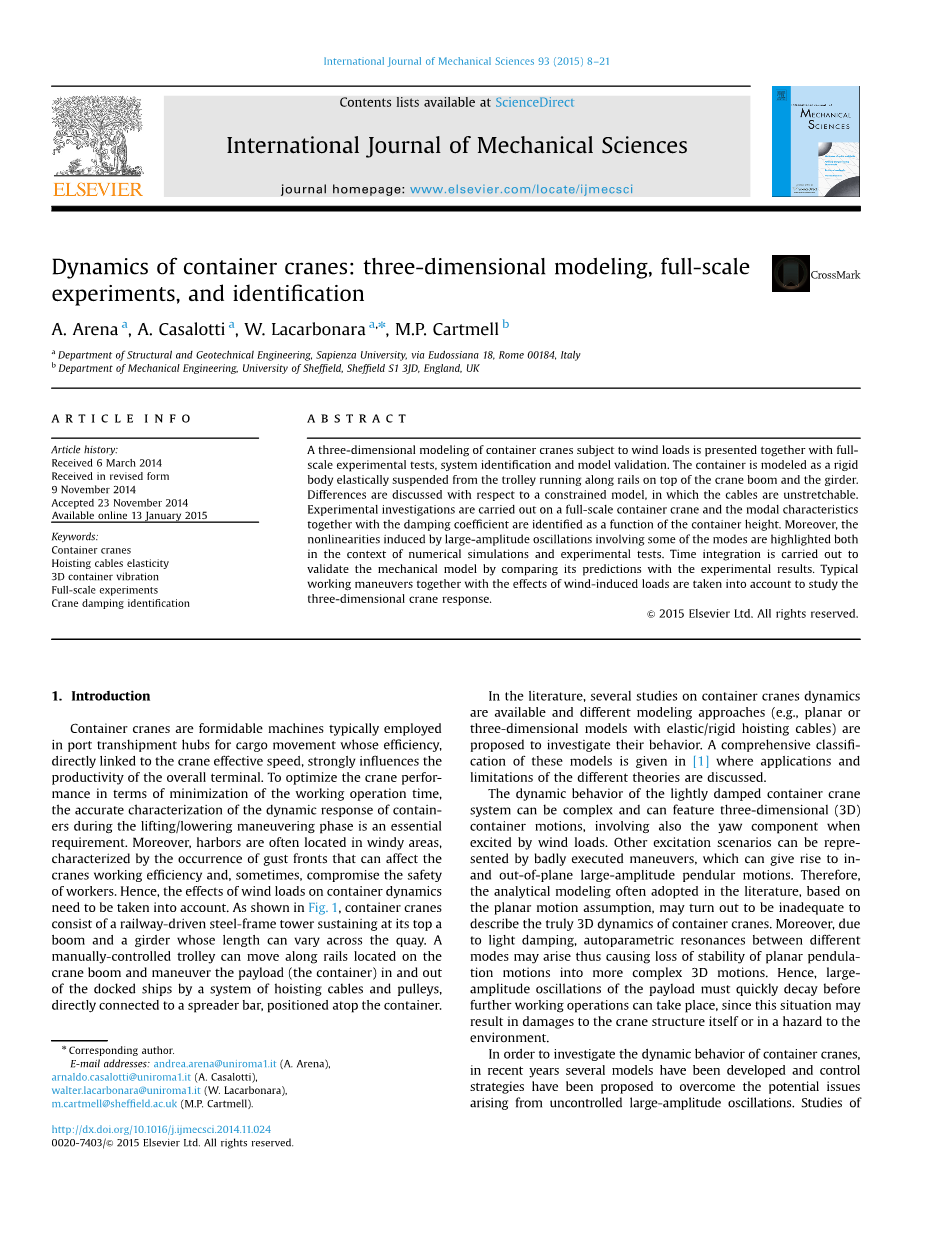 摘要:岸边集装箱起重机受到风荷载的三维建模与全尺寸实验测试,系统识别和模型验证一起呈现,岸边集装箱起重机被建模为刚性体,该刚性体从沿着起重机臂和梁的顶部上的轨道行进的手推车弹性悬挂,关于受约束模型讨论了差异,上进行,并且模态特性与阻尼系数一起被识别为岸边集装箱起重机高度的函数,其中电缆是不可拉伸的,实验研究在全尺寸集装箱起重机此外,在数值模拟和实验测试的上下文中都强调了涉及一些模式的大振幅振荡引起的非线性,进行时间积分以通过将其预测与实验结果相比较来验证机械模型,考虑了典型的工作机动以及风感负载的影响,以研究三维起重机响应。