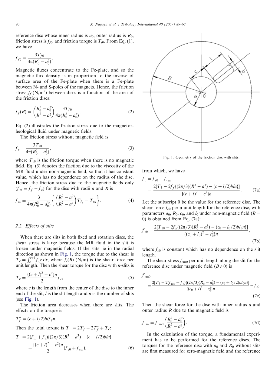 在转矩的计算中,必须对基准盘执行基本实验。首先测量具有和而不具有狭缝的参考盘的转矩,用于零磁场和参考磁通密度。将这些值代入方程(3)和(4)给出摩擦应力和。在下一步骤中,对于具有狭缝的参考盘测量没有磁场的转矩和具有参考磁通密度的。将扭矩代入方程(7b)和(7c)可得到剪切力和。将代入式(7d),可得到对于具有任意大小的a和R的盘在磁场作用下的狭缝引起的剪切力。