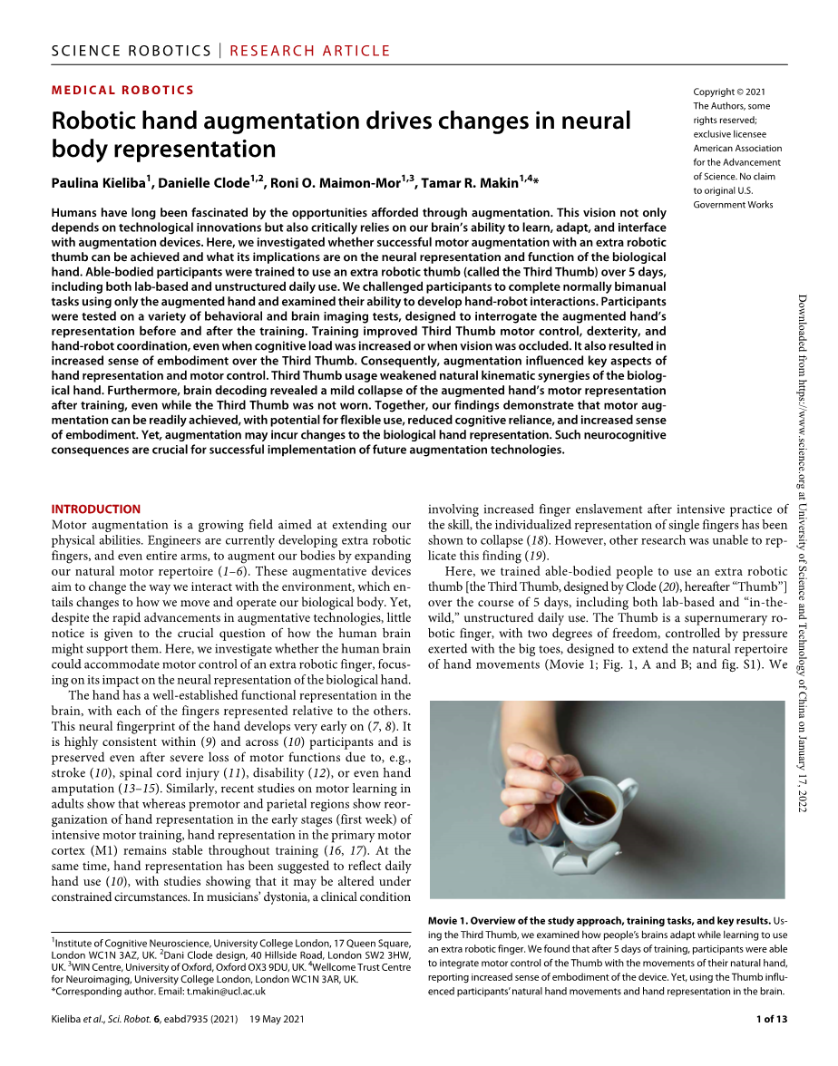 长期以来,人类一直对增强技术所带来的的可能性很感兴趣。这一愿景不仅取决于技术创新,还严重依赖于我们的大脑学习、适应和与增强设备交互的能力。在这里,我们研究了是否可以使用额外的机器人拇指成功地进行运动增强,以及它对生物手的神经表征和功能的影响。身体健全的参与者接受了超过五天的训练,以使用额外的机械拇指(称为第三拇指),其中包括基于实验的使用和非定式的日常使用。我们让参与者仅使用带有增强设备的一只手,去挑战通常用双手才能完成的任务,并检验他们培养手和机器交互协调的能力。参与者接受了各种行为和脑成像测试,旨在探究强化手在训练前后表现。训练提高了第三拇指的运动控制、灵巧性和手-机器的协调性,即使在认知负荷增加或视线受阻时也是如此。它还使得对第三拇指的感知能力有所增强。因此,运动增强影响了手部表达和运动控制的关键方面。第三个拇指的使用削弱了生物手的自然运动协同作用。此外,大脑解码显示增强手的运动表达在训练后轻度崩溃,即使在没有佩戴第三拇指的情况下也是如此。总之,我们的研究结果表明,运动增强可以很容易地实现,具有灵活使用、减少认知依赖和增强实体感的潜力。然而,增强可能会导致生物手表现的变化。这种神经认知结果对于未来增强技术的成功实施至关重要。