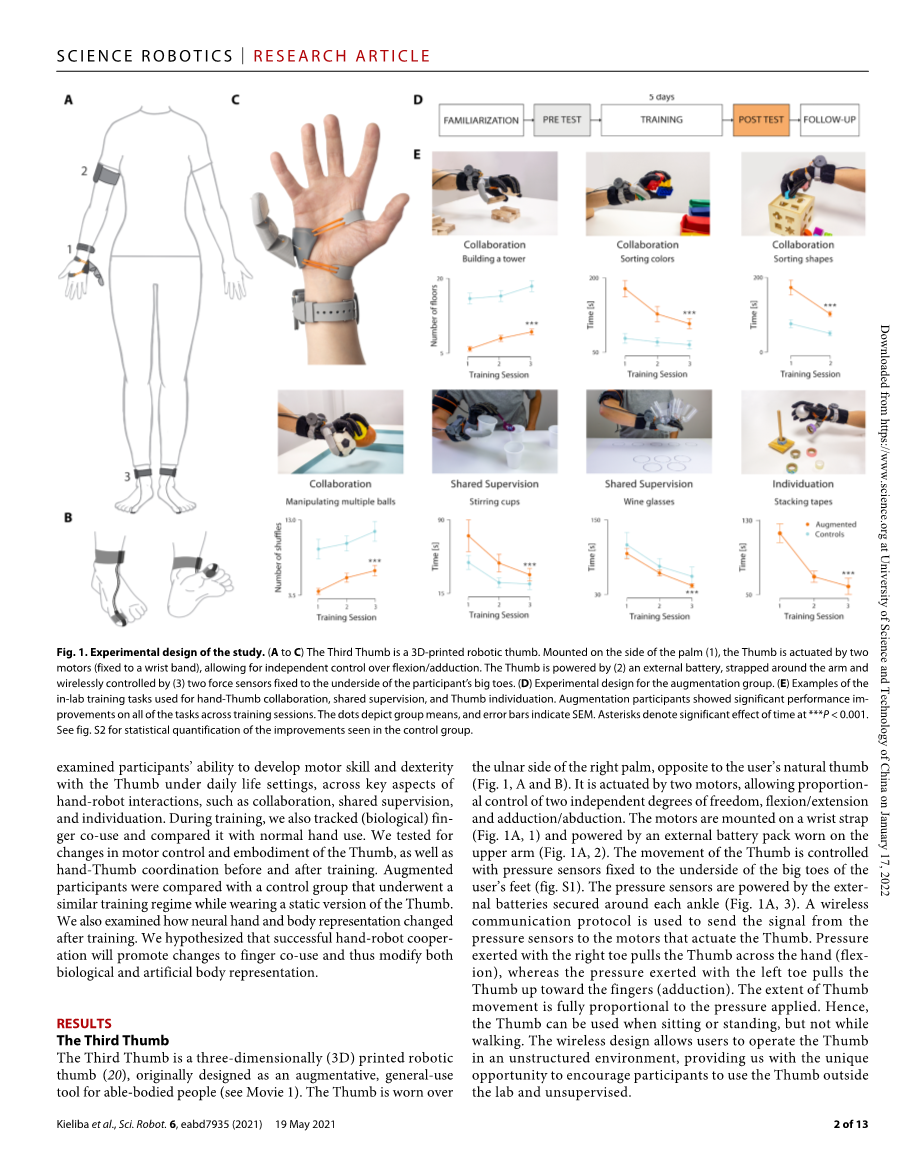在这里,我们训练了身体健全的人在5天的时间里使用额外的机械拇指 [第三拇指,由 Clode[20]设计,以下简称“拇指”],包括基于实验的和“在野外”无定式的日常使用。拇指是一个外加的机械手指,有两个自由度,由大拇指施加的压力控制,其旨在扩展手部本身全部的运动能力(视频1;图1,A和 B;和图S1)。我们测试了参与者在日常生活环境中使用拇指发展运动技能和灵巧性的能力,包括手-机器人交互这一关键方面,例如协作、共享监督和个性化。在训练期间,我们还跟踪(生物)手指共同使用并将其与正常手部使用进行比较。我们测试了运动控制和拇指实体感变化,以及训练前后的手-拇指协调性。将运动增强后的参与者与在佩戴静态版本拇指时接受类似训练的对照组进行比较。我们还测试了神经手和身体的表征训练后如何变化。我们假设成功的手-机器协同将促进手指同时使用的变化,从而改变生理和人为的身体表征。