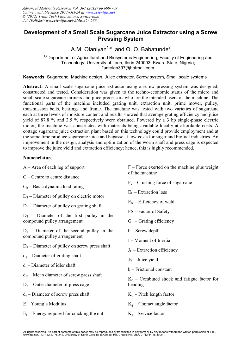 摘要:设计,建造和试验了一种使用螺旋压制系统的小规模甘蔗汁提取器。考虑了作为机器预期用户的微型和小型甘蔗农民和果汁加工者的技术经济状况。该机器的功能部件包括光栅单元,提取单元,原动机,滑轮,传动皮带,轴承和框架。该机器用两种甘蔗水平测试,每种水分含量为三个水平,结果表明,平均光栅效率和果汁产率分别为87.8%和2.5%。由一台3马力的单相电动机驱动,该机器的材料可在当地获得,价格合理。基于这项技术的山寨甘蔗汁提取厂可以提供就业,同时以低成本为糖和生物燃料工业生产甘蔗汁和甘蔗渣。预期蜗杆轴和压力机笼的设计,分析和优化的改进将提高果汁产量和提取效率;因此,这是强烈建议的。