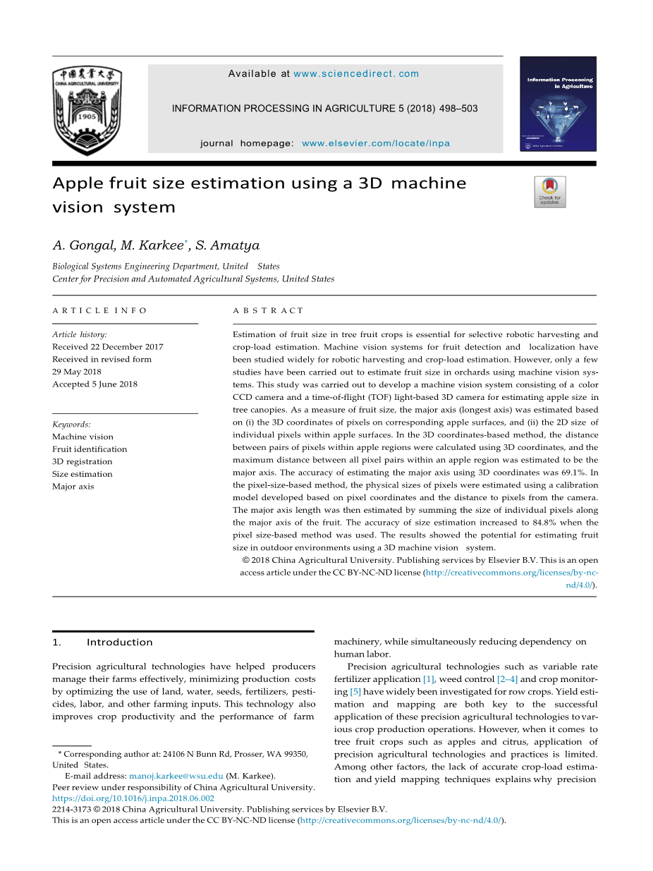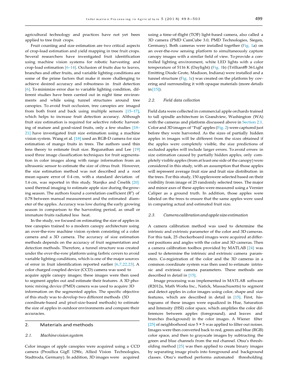 摘要:果树果实大小的估算是进行选择性机械收获和作物负荷估算的关键。用于水果检测和定位的机器视觉系统得到了广泛的研究。 用于机器人收割和作物负荷估计。然而,在利用机器视觉估计果实大小的研究还很少。这项研究是对d进行的。 一种机器视觉系统,由彩色CCD摄像机和飞行时间(基于光线)的3D摄像机组成,用于估计树上苹果的大小。作为衡量水果大小的指标,它的主轴 根据(I)相应苹果表面像素的三维坐标和(2)苹果表面单个像素的二维尺寸估算出(最长轴)。在基于三维坐标的MET中 利用三维坐标计算了苹果区域内像素对之间的距离,并估计出苹果区域内所有像素对之间的最大距离为 或者轴心。利用三维坐标估计主轴的精度为100%。在基于像素大小的方法中,像素的物理尺寸是使用一个基于校准模型的方法来估计的。 关于像素坐标和距相机像素的距离。然后,根据果实长轴上单个像素的大小估算出果实的长轴长度。s的精度 当采用基于像素大小的方法时,IZE估计值提高到了约简率。结果表明,利用三维机器视觉系统可以在室外环境下对果实大小进行估计。