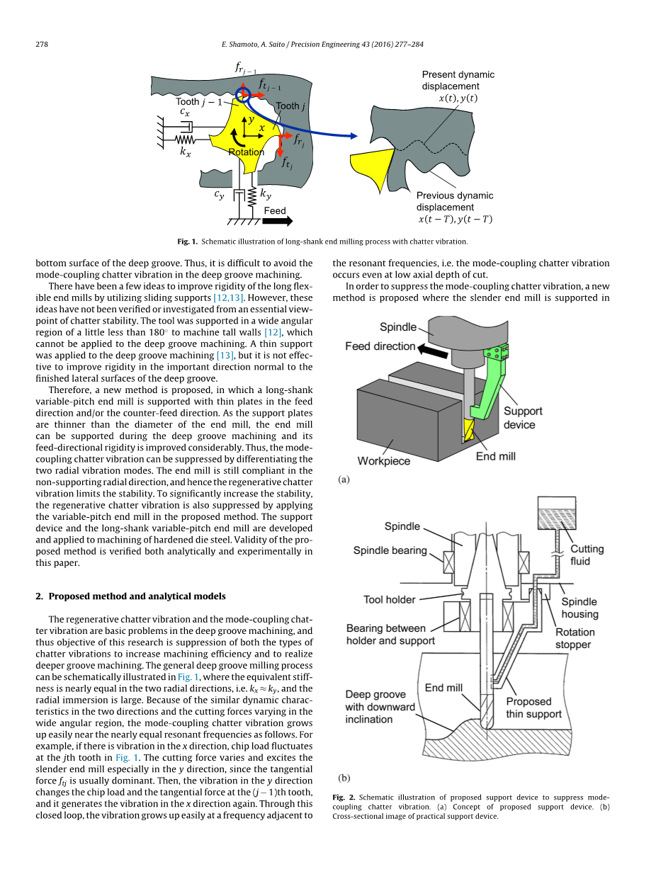 有许多研究的再生颤振。例如,著名的颤振稳定域表明高主轴转速[1,2]的颤振稳定性增加。然而,它是困难的,以提高稳定性显着,因为模具和模具一般很难,不能在足够高的主轴转速加工。它也被称为再生颤振可采用变桨距端lowast;通讯作者抑制。电话: 81 52 789 2705;传真: 81 52 789 5305。电子邮件地址:shamoto@mech.nagoya-u.ac.jp(E.社本信行)。在适当的条件下[3,4],通过在多个研磨施加的速度差异的方法轧机操作[5],通过优化工具路径/姿势[6,7]等另一方面,已经有一些研究上该模态耦合颤动;提出了具有不相等的模式一细长立铣刀,它是通过利用一个分析模型[8,9]验证。然而,它是澄清,该分析模型是有效的只有在非常低的转速,因为它不考虑旋转依赖诸如科里奥利力和离心力。通过考虑旋转相关的条款在分析和进行实际的加工试验,它也发现,在实际条件下,细长的立铣刀与不平等的模式是不有效的[ 10 ]。其结果是,在深槽加工中,没有一种抑制模态耦合振动的好方法。