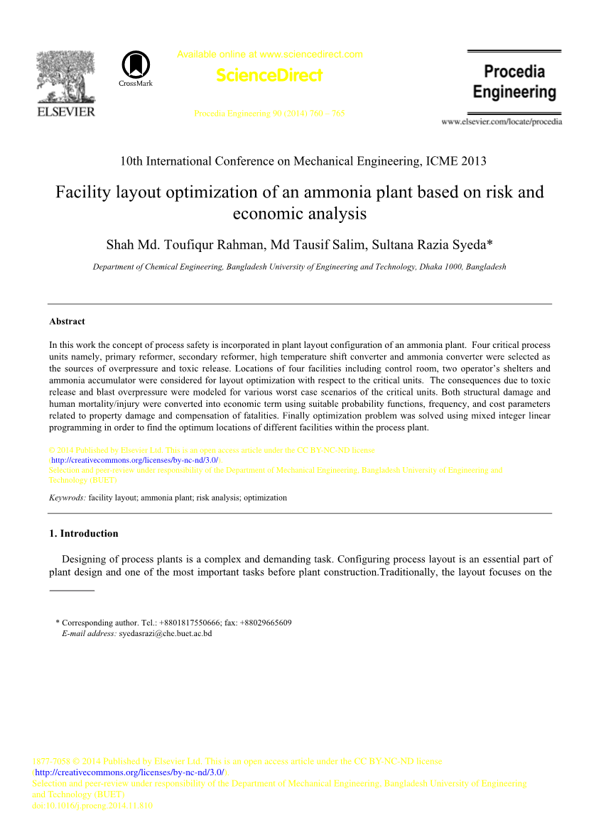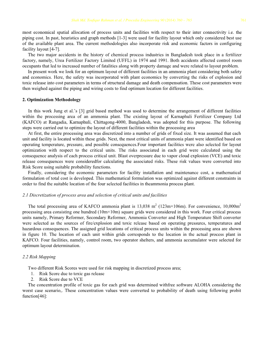 在这个工作中工程安全的概念成为一个氨厂设备布局构造的一部分。四个关键工艺单元即,初级转换炉,二段转换炉,高温变换炉和氨合成塔被选作为超压和有毒的释放源。四个设备的位置,包括控制室,两个操作室和氨气的收集器被认为是布局优化的关键单元。由于有毒气体释放和爆炸超压的结果,关键单元被建模成各种各样最糟糕的情况。结构的破坏和人类的损伤被转换使用合适概率函数,频率和成本参数的经济模型,这些参数与适当的破坏和死亡事故的赔偿有关。最后为了找出不同设施和工程设备的最优位置,使用混合证书线性优化项目来求解优化问题。