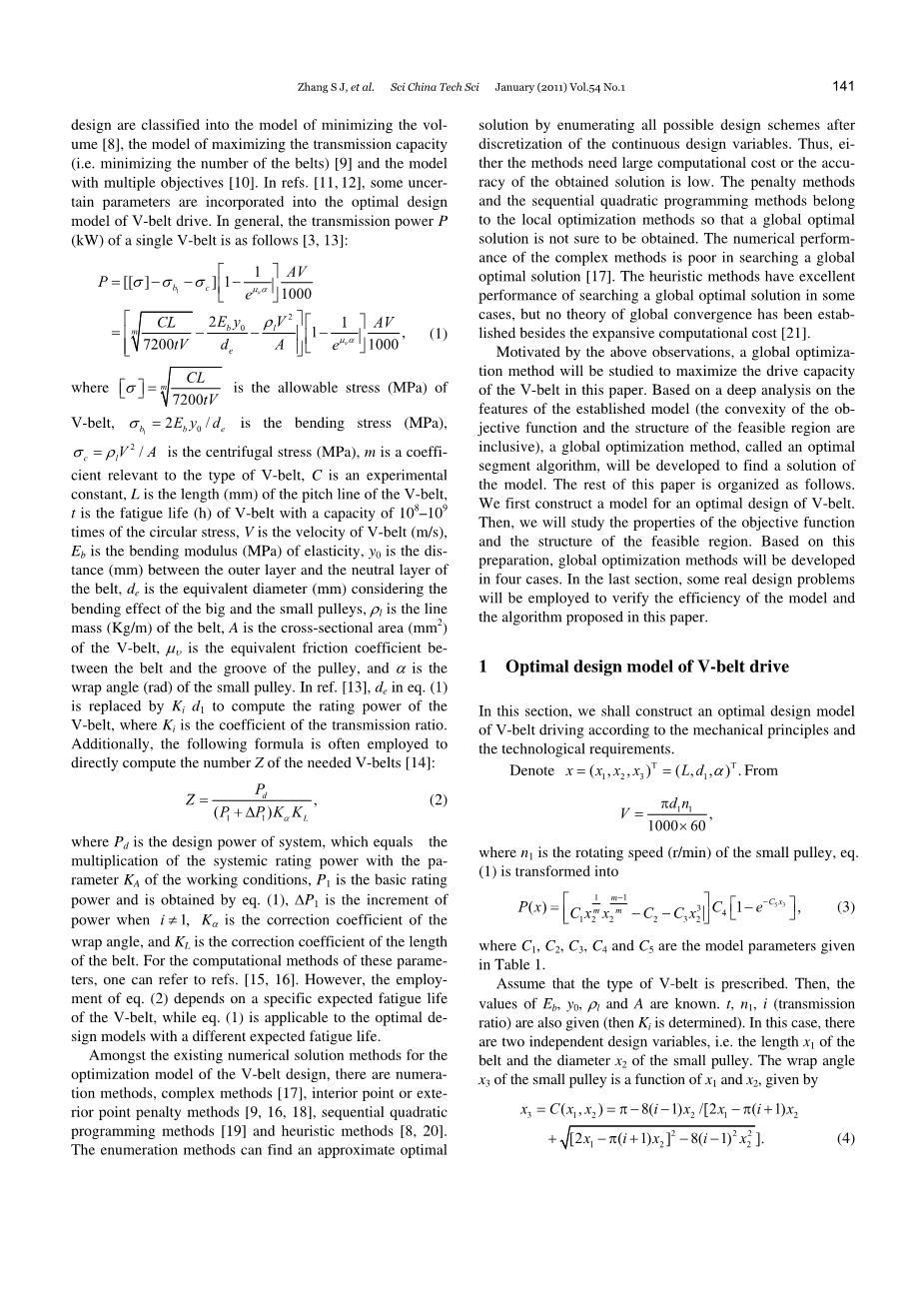 PD系统的设计功率,它等于该系统的额定功率倍增的工况参数Ka,P1基本额定功率和通过式(1),Delta;P1是权力的增量,当ine;1,Kalpha;是包角修正系数,和KL是皮带的长度修正系数,[15,16]。公式(2)适用于特定的预期寿命的带,而式(1)适用于具有不同预期疲劳寿命的优化设计模型,现有的对V带的优化设计模型计算方法有数值求解方法,复杂的方法有[ 17 ],内点和外点罚函数方法[ 9,16,18 ],[ 19 ]的序列二次规划方法和启发式方法[ 8,20 ]。枚举的方法可以通过枚举所有可能的设计方案,连续变量离散化后找到一个近似最优解。