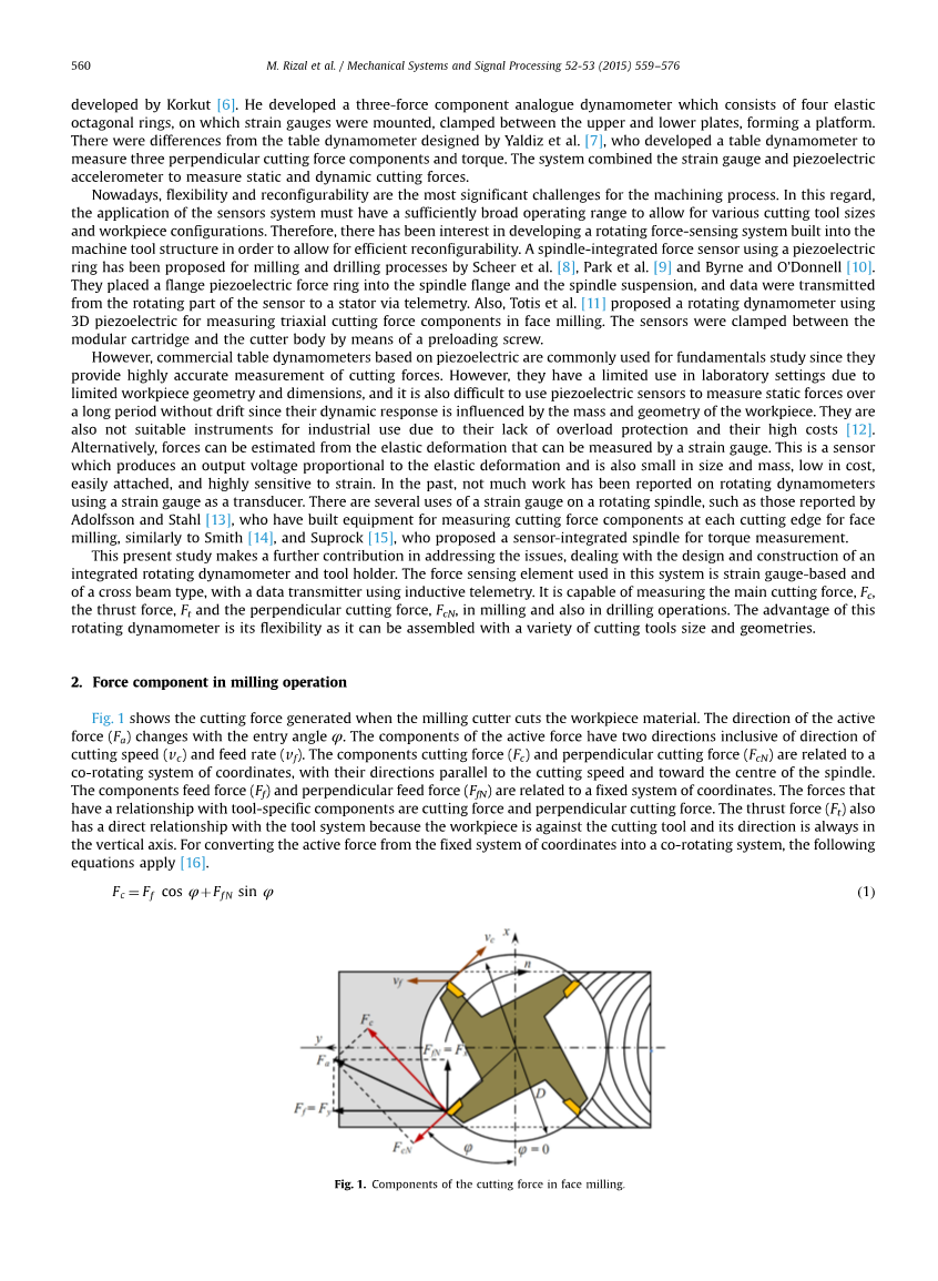 然而, ,自从人们提供高度精确测量切削力时,工业的测功表一般用于压电测量的基本研究。然而,他们在实验室设置由于有限使用工件的几何形状和尺寸有限,也很难使用压电传感器来测量静态力,长时间的动态运动测量受工件的质量和几何形状的影响。他们是也不是工业上的合适工具,因为他们缺乏过载保护而且花费很高的成本。另外,中间压力可以通过弹性变形由应变计测得。这个传感器产生输出电压正比于弹性变形,同时拥有小的规模和质量,低成本,可以简单的连接,并对形变高度敏感。在过去,没有多少报刊报道使用旋转测应变计作为传感器。有几种使用应变计的旋转主轴,如那些报道Adolfsson和Stahl建立了切削力测量设备组件在每个切削刃的面铣削,类似于Smith 、Suprock[提集成传感器主轴扭矩测量。