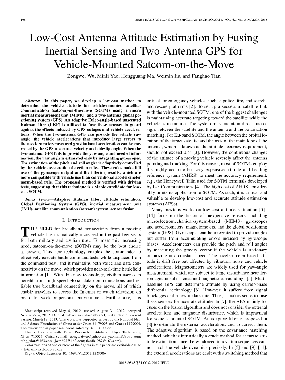 低成本天线姿态估计融合惯性传 感和双天线全球定位系统车载的移动卫星通信外文翻译资料