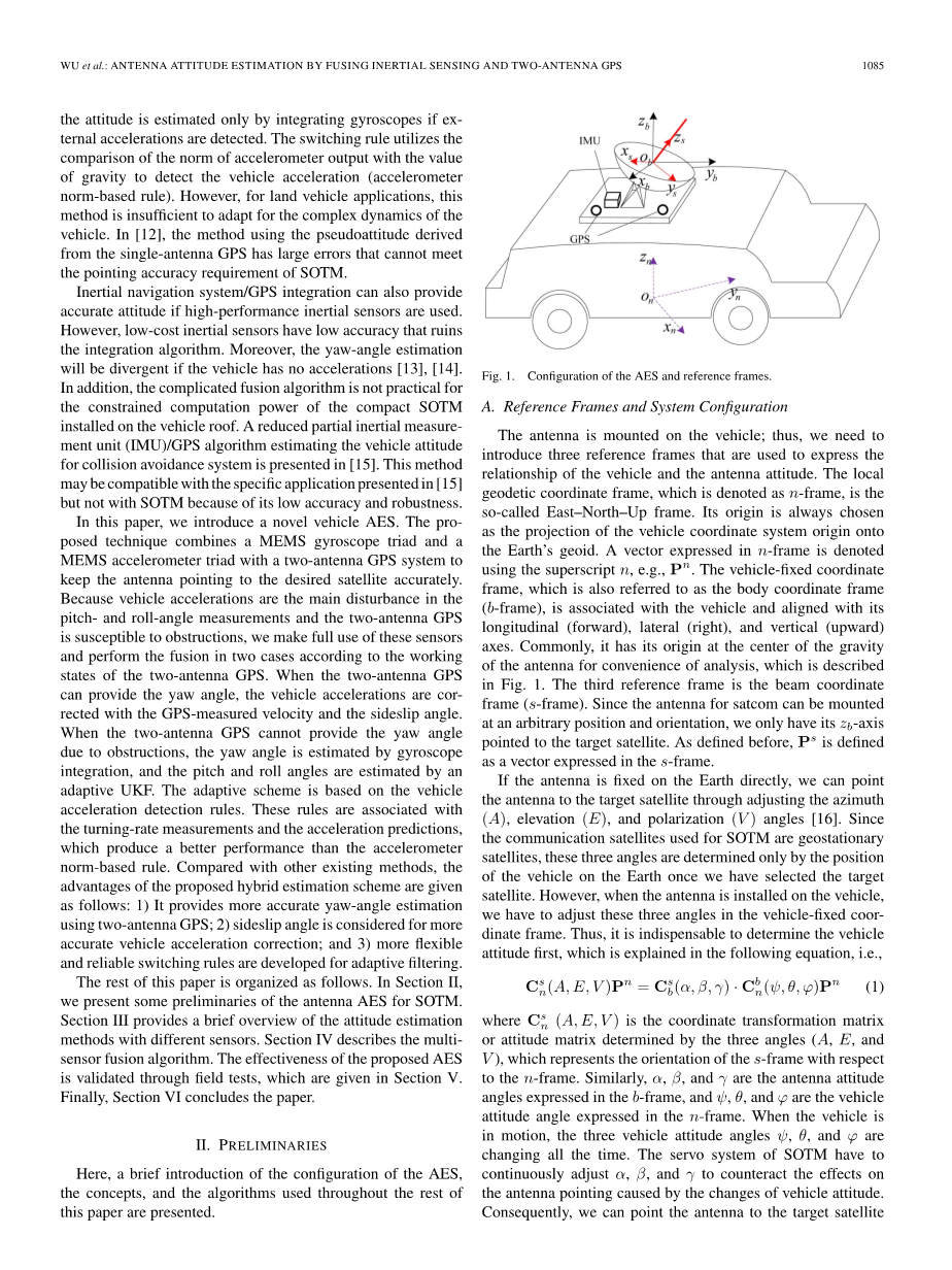 本文的其余部分组织如下。在第二节,我们提出了“动中通”天线的AES一些预备知识。第三节提供了一个简短的概述的态度估计不同传感器的方法。第四节介绍的多传感器融合算法。对AES的效果通过现场测试,这是在第五节进行验证。最后,第六节总结了论文。