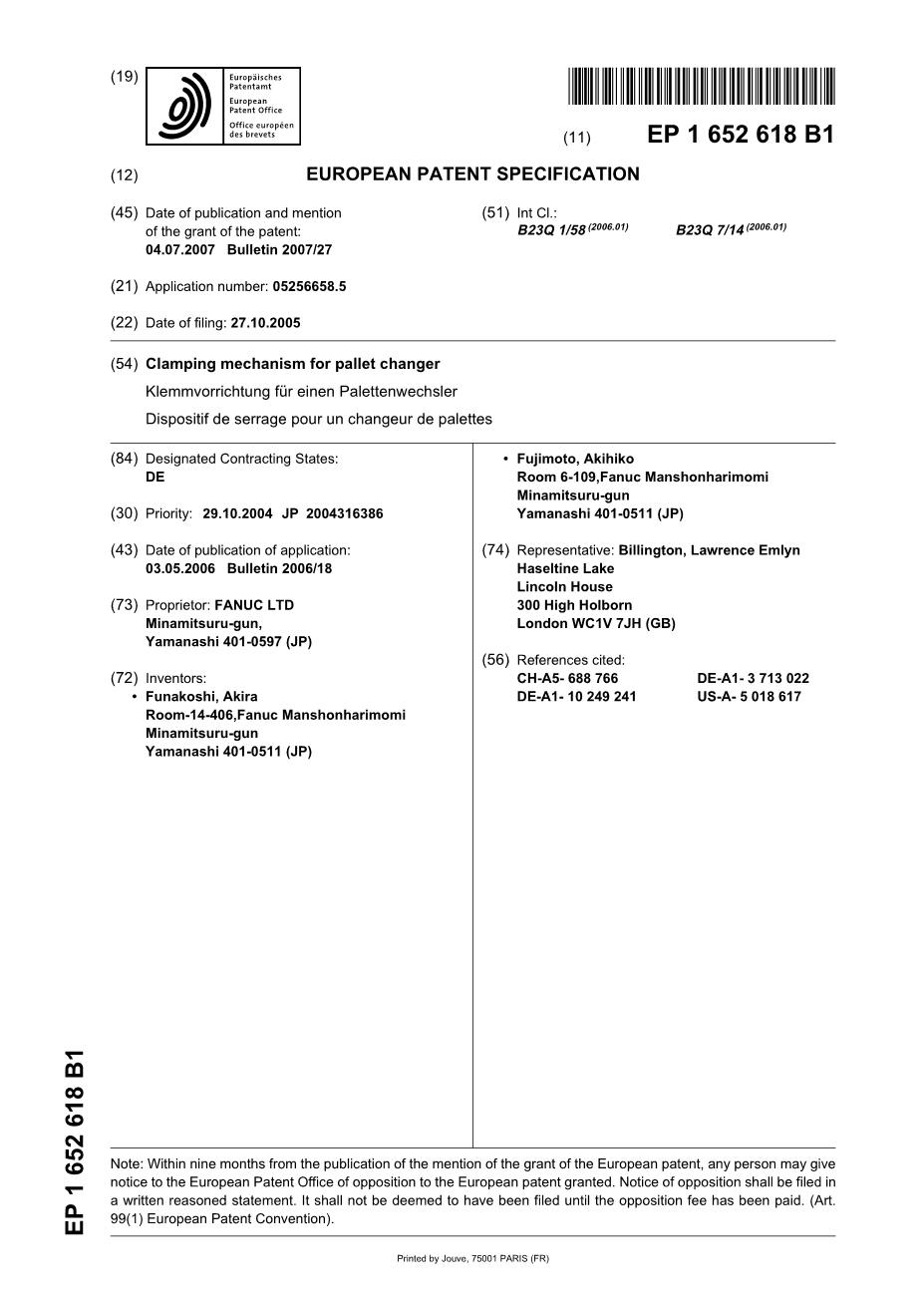 [0007] 本发明包括一种机床,其包括工作台,则工具是配合托盘更换,用于改变工件安装托盘,使得工件安装托盘可以从这样的托盘更换到在相同的平面上的工作台,该工作台包括:支撑装置AR不等用于输送工件安装托盘上,以及从工作台中的一个方向支撑一个工件安装托板;和夹紧装置,支撑装置是支撑在松开输送工件安装托盘的托盘;其特征在于该夹紧装置是这样的,