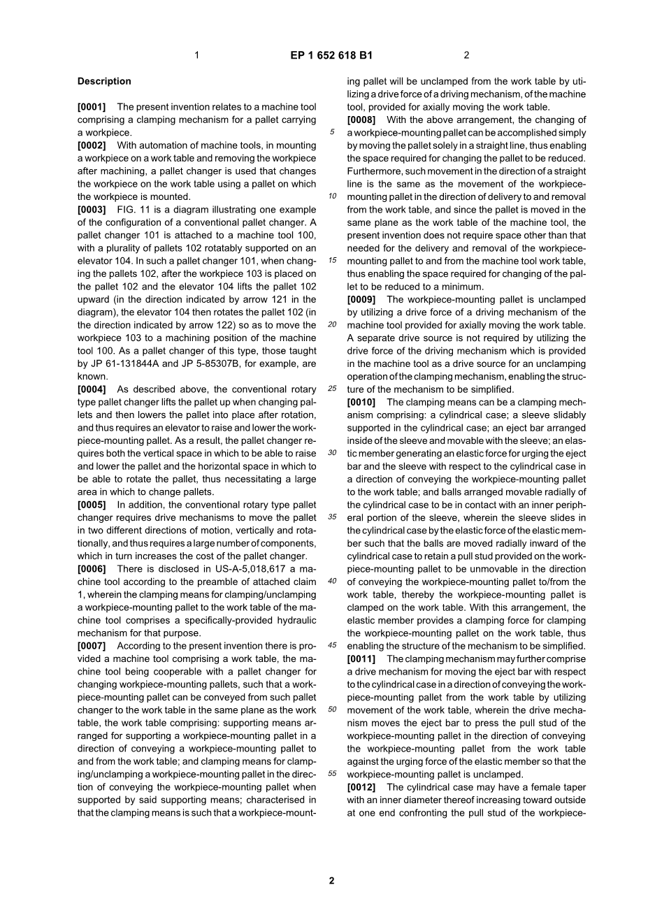 [0009] 工件安装托盘是利用提供用于轴向移动所述工作台的机床的驱动机构的驱动力夹紧。一个单独的驱动源是在机床作为夹持机构的松开动作的驱动源提供的驱动机构的驱动力,这是使该机构的结构加以简化所必需的。