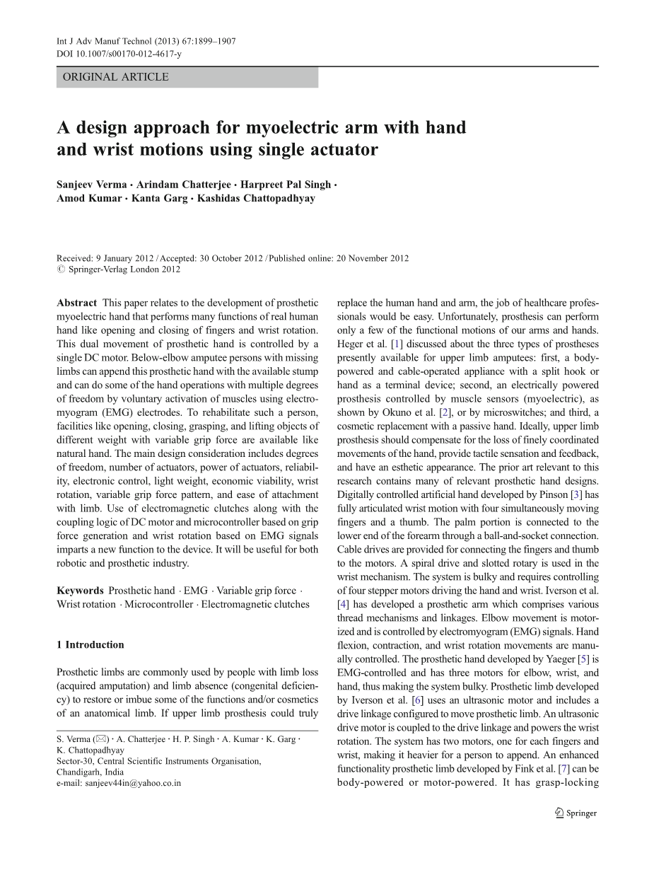 使用单致动器肌电臂手和手腕动作的设计方案外文翻译资料