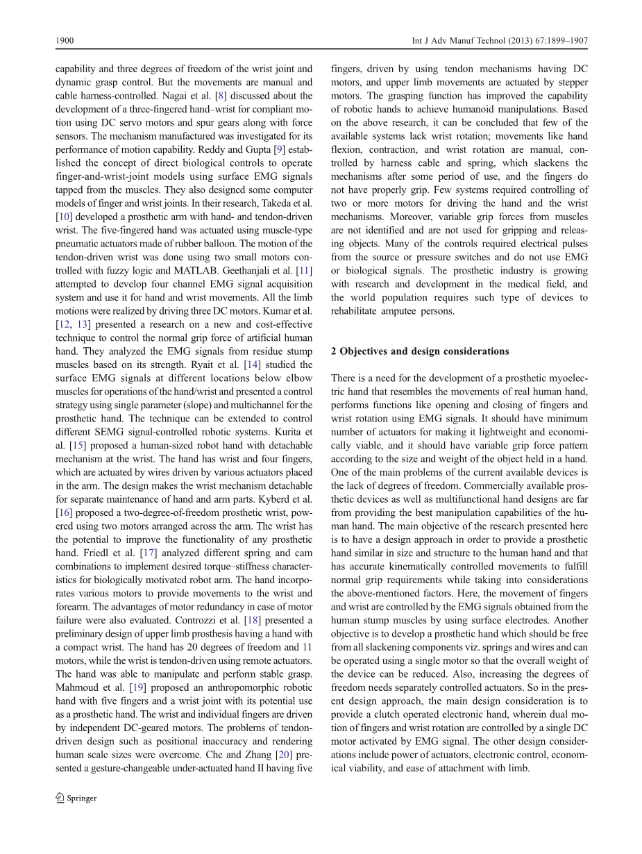 这是一个人工电方面类似于人的手的动作发展的需要,就像开手指和手腕的转动采用肌电信号关闭功能。它应该使用更轻、经济上可行的最低数量的驱动器,它应该根据大小和抓在手上的物体重量变握力模式。目前可用的设备的主要问题之一是缺乏自由度。市售的人工假体装置以及多功能方面的设计是提供人的手最好的操纵能力。这里主要提出的研究的目的是为了提供一个与假手相似的大小和结构,人手的一个设计的方法,具有精确的运动控制的运动履行正常的控制要求的同时,考虑上述因素的影响。在这里,手指和手腕的运动控制由使用表面电极从人的残端肌肉获得的肌电信号。另一个目的是开发一个假手应无松动部件。弹簧和电线,可以使用一个单一的电机,使设备的整体重量可以减少。此外,增加的自由度需要分别控制执行器。所以在 现阶段的设计方法,设计主要考虑的是提供一个离合器操作的电子手,其中双运动手指和手腕的转动是由一个单一的直流电机通过肌电信号激活控制。其他设计考虑,包括功率驱动器、电子控制、经济活力,以及附着肢体放松。