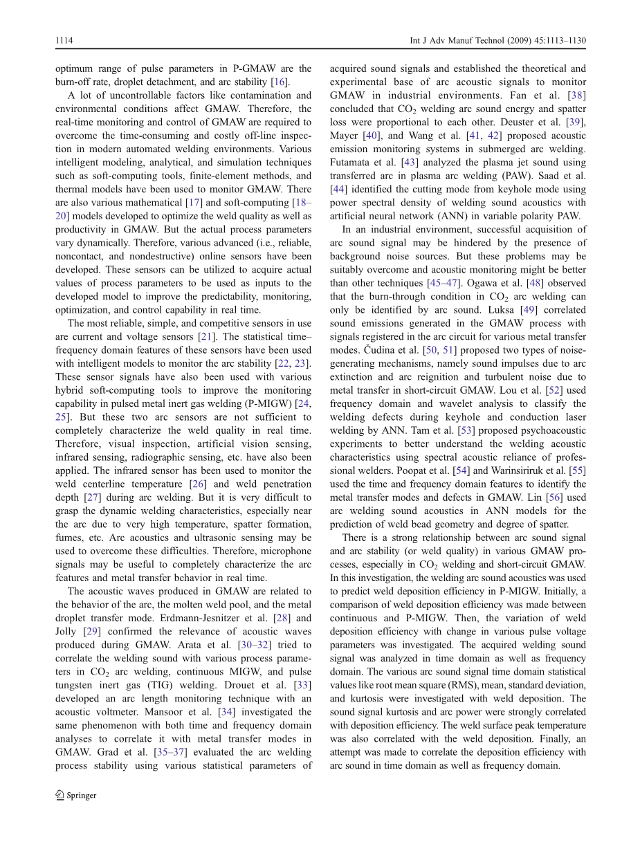 在GMAW产生的声波与电弧的状态、熔融焊缝池、金属液滴传输模式相关。Erdmann-Jesnitzer、Jolly等证实在熔化极气体保护焊中声波的相关性。Arata等试图分别在持续MIGW、CO2电弧焊、脉冲钨极惰性气体保护焊(TIG)中关联焊接声音与各种工艺参数。Drouet等开发了一个用声压表监测弧长的技术。Mansoor等将在熔化极气体保护焊中同一现象的时频分析与金属过渡模式联系在一起。Grad等使用各种统计参数评估电弧焊接过程稳定性,获得声音信号,建立了理论和实验为基础的电弧声信号来监控工业环境中熔化极气体保护焊。Fan等得出的结论是二氧化碳焊接电弧声能量和飞溅损失成比例。Deuster,Mayer, Wang等人提出了在埋弧焊声发射监测系统。Futamata等用转移弧等离子弧焊(PAW) 分析了等离子体喷射的声音。Saad等使用良好焊接声音的功率谱密度与人工神经网络(ANN) 从钥匙孔模式确定了在变量极性PAW中切削模式。