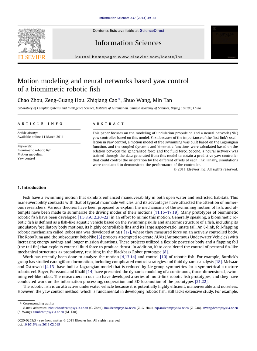 本文着重于仿生机器鱼波动推进的建模和基于该模型的神经网络偏航控制器的仿真。