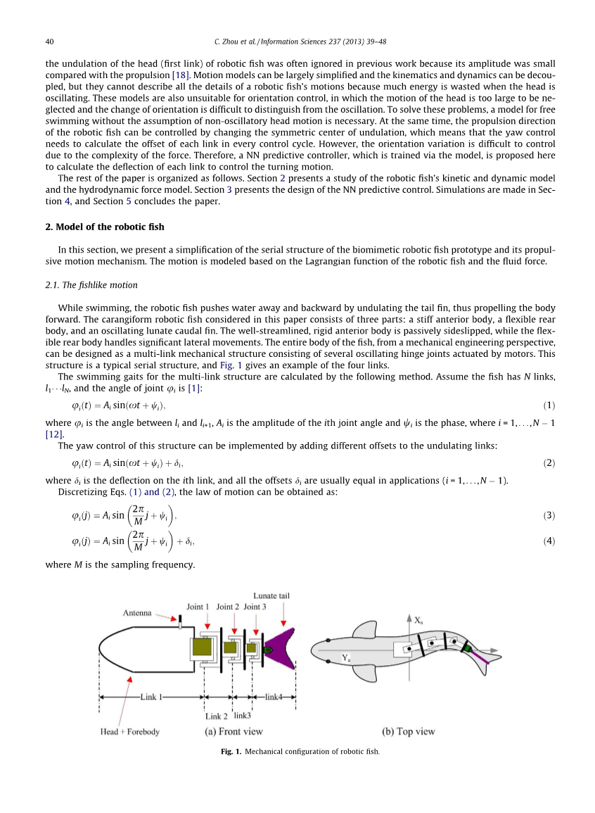 本文的其余部分安排如下。 第2节介绍了机器鱼的动力学和动力学模型和水动力模型的研究。 第3节介绍了神经网络预测控制的设计。 模拟在第4节做出,第5节结束本文。