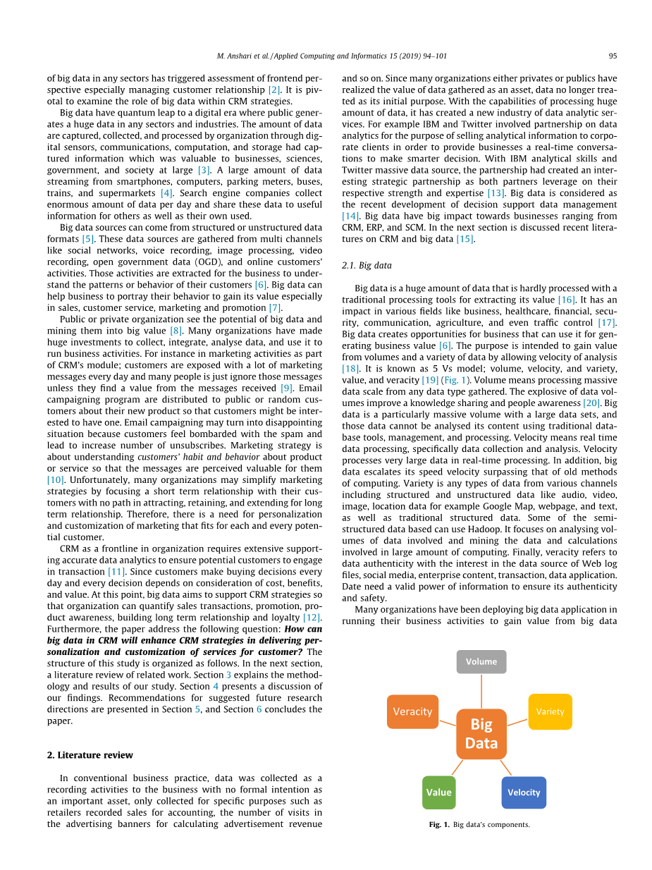 这项研究调查了组织考虑采用大数据的因素。这项研究的目的是调查一个组织最近采用的大数据。这些方法包括对商业组织大数据的最新研究进行深入分析。本报告的数据是通过对2010年至2015年文章的文献回顾得出的。之所以选择这个时间段,是因为大数据的速度,任何老文章都可能有不相关的信息。内容分析用于回顾发表在peerrewiew期刊上的大数据文献综述[36]。然后,审查过程被分为一个专题。我们将各种可能的解决方案增强并整合到所提出的模型中。我们只选择发表在同行评议期刊上的英文文章。在删除了本研究范围之外的重复项和文章之后,对这些文章进行了回顾,以提取CRM的特征和图5中的大数据能力。