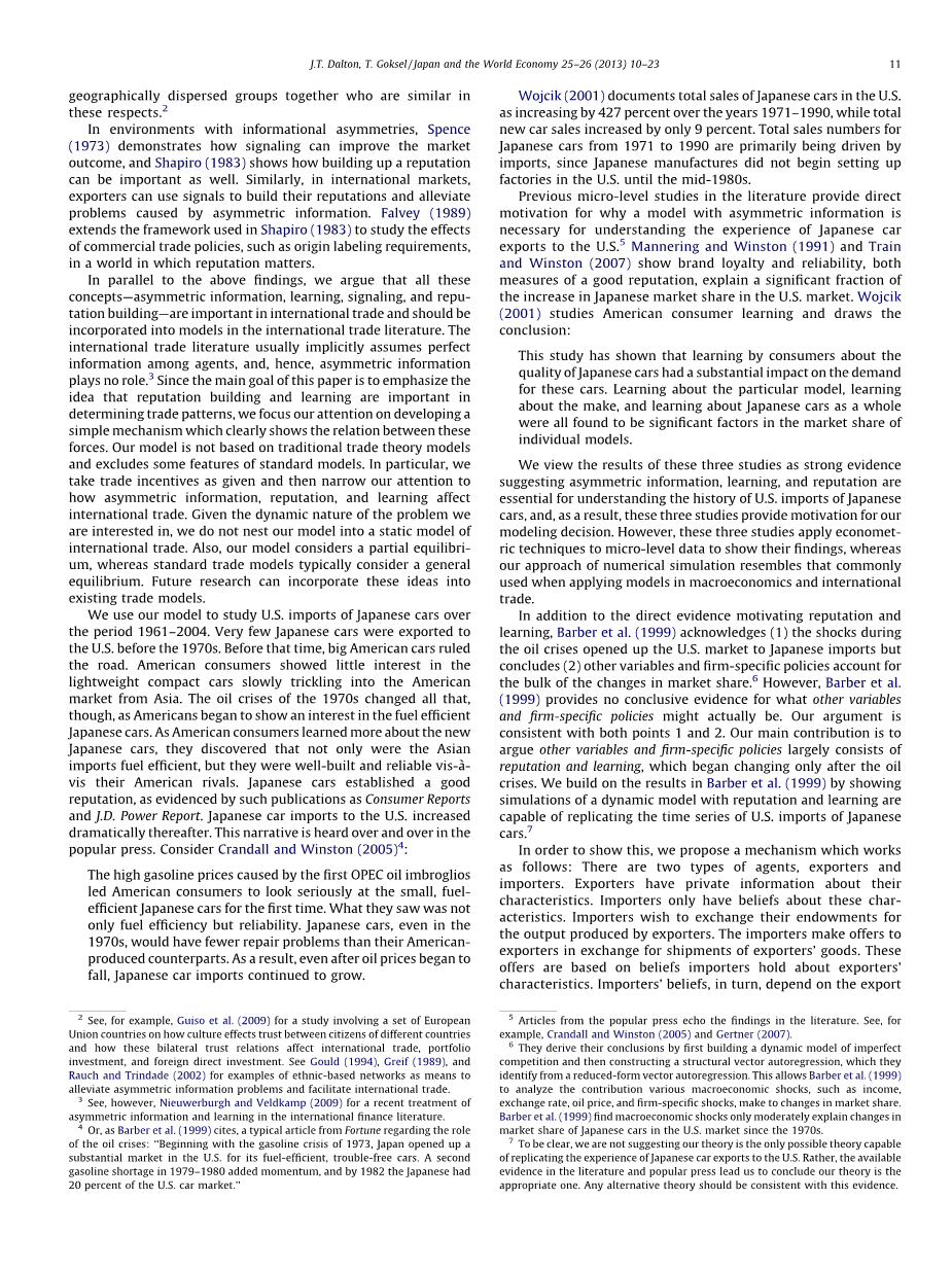 我们认为这三项研究的结果是有力的证据,它们表明不对称的信息、传递的信息和建立的声誉在美国进口日本汽车的历史中至关重要,因此,这三项研究为我们的建模决策提供了动力。然而,这三项研究将计量经济学技术应用于微观层面的数据,以显示他们的发现,而我们的数值模拟方法类似于在宏观经济和国际贸易中应用模型时常用的方法。