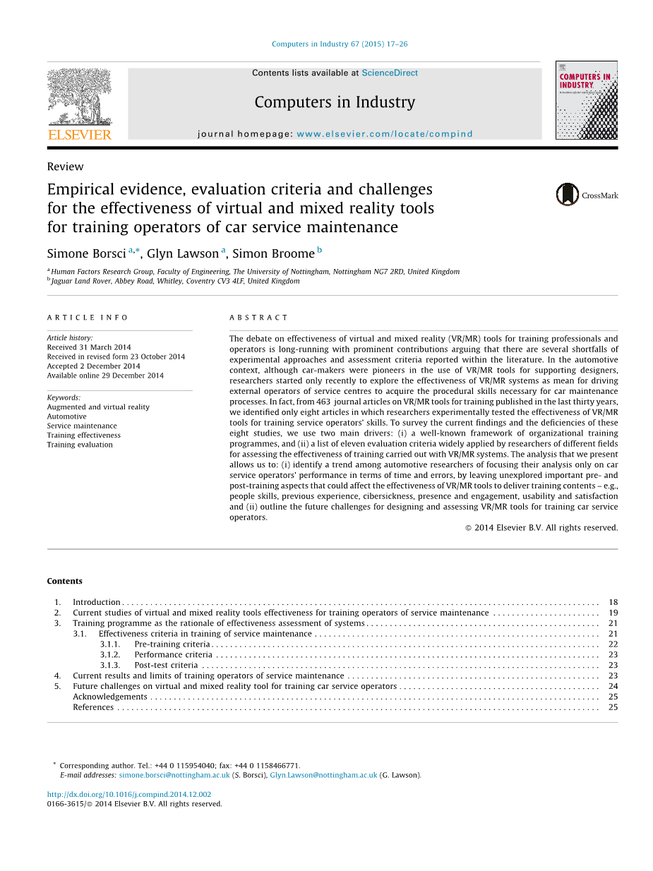 本文考虑了应用虚拟现实/混合现实工具的一个培训计划的重要性,旨在调查目前对于培训操作人员在服务维护的产品方面的程序性技能的来评估虚拟现实/混合现实的有效性的方法,涉及到汽车领域与特定的利益相关的有效性数据。我们使用的训练方案设计公知采用了著名的框架[30,32,33]和一套应用于不同领域培训的实验研究的评价标准,如司机:(一)确定当前结果和这些研究在研究人员应用的评价标准方面的限制,及(二)概述在应用虚拟现实/ 混合现实工具培训汽车服务养护时未来面临的挑战。