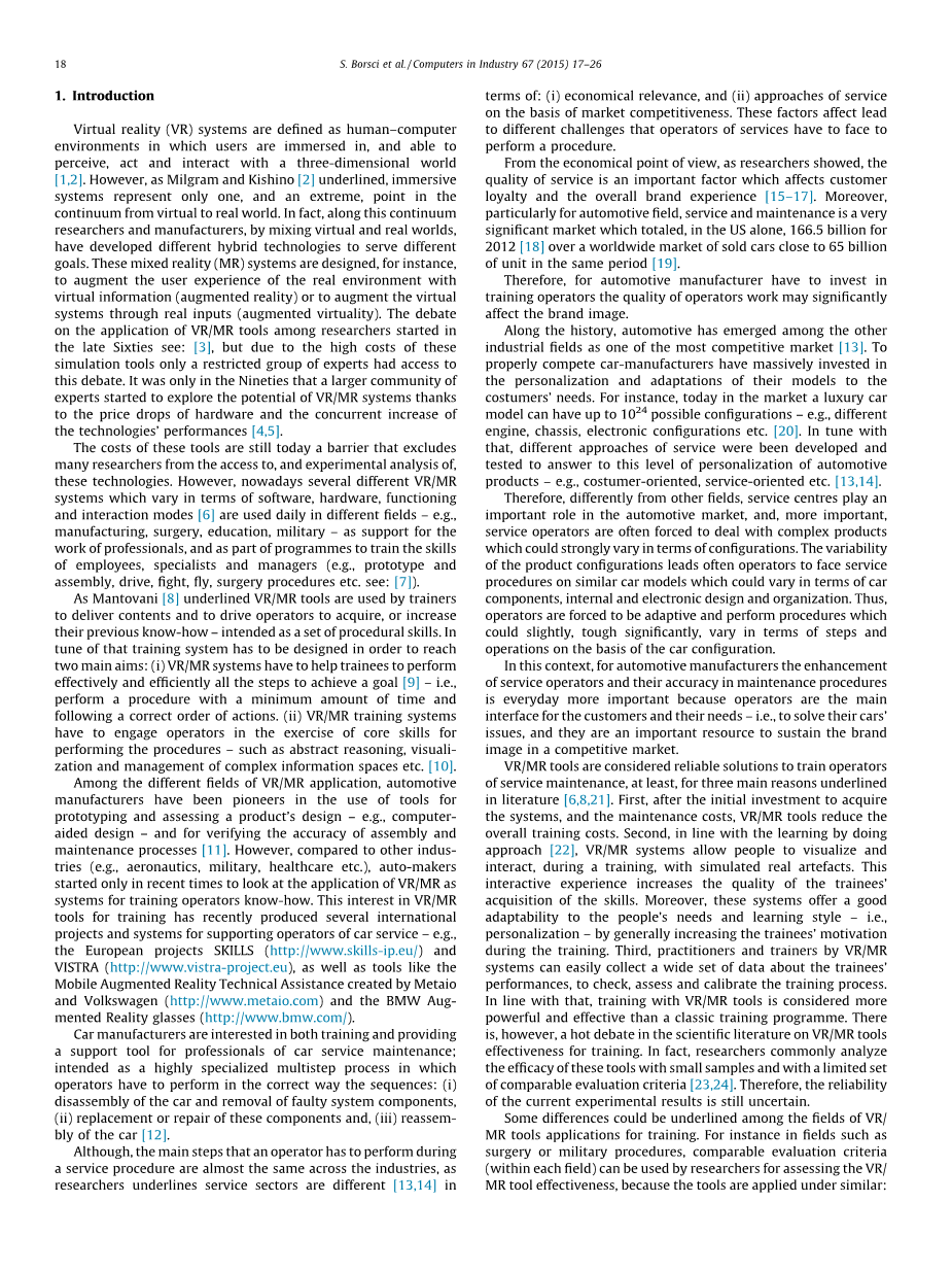 对于培训运营商与操作人员的虚拟现实和混合现实的工具的有效性的争论(虚拟现实 / 混合现实)一直存在着,关于突出贡献的争论,在文献中,有一些关于实验方法和评估标准的不足。在汽车方面,尽管汽车制造商在使用虚拟现实 / 混合现实工具来支撑设计师方面是先驱者,研究者们只在最近才开始发掘虚拟现实 / 混合现实系统的有效性作为对驾驶服务中心的外部运营商来说在汽车维修程序中获得必要的技能流程的一种工具。事实上,从在过去三十年刊登的关于虚拟现实 / 混合现实工具训练的463期刊文章中,在研究人员测试虚拟现实 / 混合现实工具对于培训服务运营商的技能的有效性的实验中,我们只认证八篇文章。为了调查这八项研究中目前的研究结果以及不足,我们使用了两个主要驱动因素:(一)组织培训项目的知名框架和(二)一份列有十一个由不同领域的研究人员使用虚拟现实 / 混合现实系统对于评估培训效果广泛应用的评价标准的清单列表。我们目前的分析允许我们来:(一)确认将他们的分析只聚焦于分析汽车服务运营商在时间和错误方面的表现的汽车研究人员的一种趋势,留下未开发的重要的培训前和培训后的可能会影响的虚拟现实 / 混合现实工具有效性的方面来提供培训的内容 - 例如,人际交往能力,以往的经验,存在和参与,可用性和满意度及(二)概述了设计和评估用于培训汽车服务运营商的虚拟现实 / 混合现实工具未来所面临的挑战。