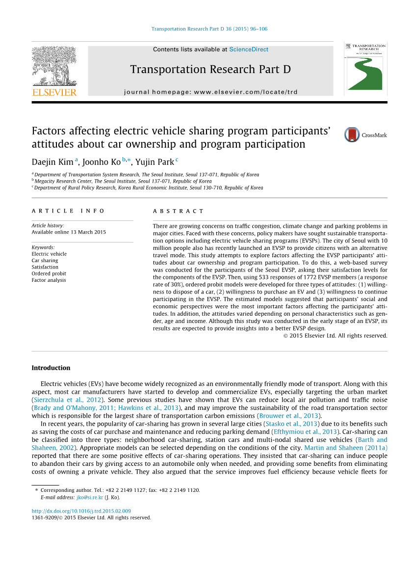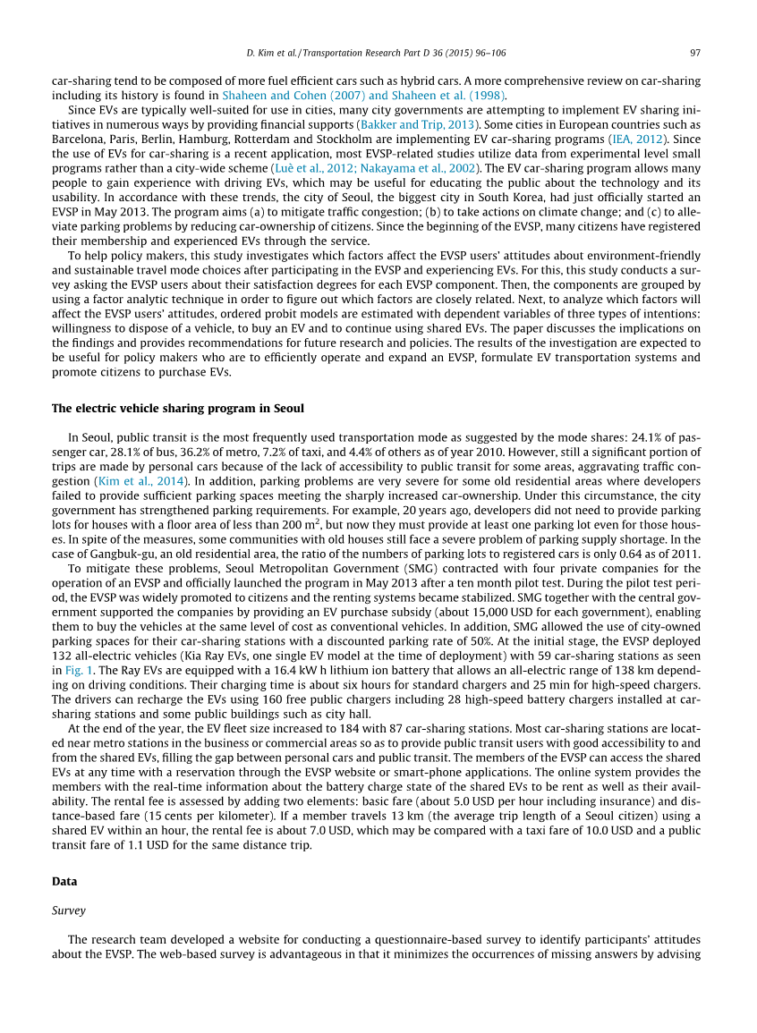 电动汽车(EV)已成为公认的环境友好的运输方式。在这方面,大多数汽车制造商已经开始开发和商业化的电动汽车,尤其是针对城市市场(Sierzchula 等, 2012)。以前的一些研究表明,电动汽车可以减少当地的空气污染和交通噪声(Brady and Orsquo;Mahony, 2011; Hawkins 等人, 2013),并可提高道路交通运输部门负责运输的碳排放量的最大份额的可持续性(Brouwer 等,2013),可以提高道路交通运输部门负责运输的碳排放量的最大份额的可持续性(Brouwer 等,2013)。近年来,汽车共享的普及已经在几个大城市发展(Stasko 等,2013)由于它的好处,如节能汽车的购买和维护成本和减少停车需求(Efthymiou 等, 2013)。汽车共享可以分为三种类型:邻里共享汽车,站车和多节点共享使用的车辆 (Barth and Shaheen, 2002)。根据城市的情况,可以选择合适的模型。马丁和沙欣(2011a)报道:汽车共享业务有正面的影响。他们坚持认为,汽车共享可以诱导人们放弃他们的汽车,在需要的时候获得一辆汽车,并提供了一些好处,从消除拥有私人车辆的成本。他们还认为,该服务提高了燃油效率,因为汽车共享的车辆,往往是由更多的燃油效率的汽车,如混合动力汽车。并且沙欣和科恩(2007)和沙欣等人(1998)发现汽车共享的更全面的检讨包括它的历史。由于电动汽车是典型适合于城市的类型,许多城市的政府正试图实现电动汽车共享计划并且在许多方面提供财务支持 (Bakker and Trip, 2013)。在欧洲国家,如巴塞罗那,巴黎,柏林,汉堡,鹿特丹和斯德哥尔摩的一些城市,实施电动汽车共享计划(IEA,2012)。由于汽车共享电动汽车的使用是一个新的应用,最刺激的相关研究是利用数据从实验水平来获取程序,而不是一个城市范围的方案 (Lue 等, 2012; Nakayama 等, 2002)。电动汽车共享计划,让许多人获得驾驶电动汽车的经验,从而为教育公众有关的技术提供可用性的支持。根据这些趋势,韩国最大的城市首尔,刚刚正式开始实行2013个EVSP。该计划旨在(a)减轻交通拥堵;(b)采取行动应对气候变化;(c)通过减少汽车保有量来缓解停车问题。从EVSP开始,许多已经注册会员的市民和有经验的电动汽车使用者将享受这个服务。