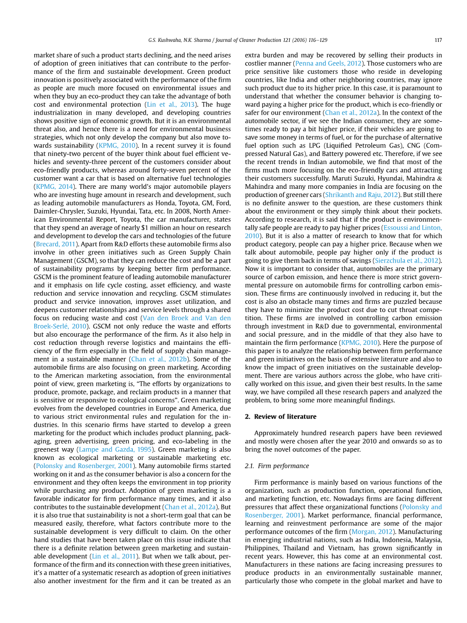 近年来,汽车市场迅速增长,不仅在欧洲和美国,在世界其他国家也是这样。由于全球市场需求的上升,汽车制造企业在生产过程中不断地参与,并获得高销售。另一方面,这些厂商面临着双重压力。第一个是符合国家可持续发展的环境规范,第二是保持长期的经营业绩。控制碳排放是这些汽车制造商面临的最大的挑战。这些公司面临成本、加强环境规范所造成的压力,并且这些公司更多的投资研发产品以减少或不伤害自然环境 (McKinsey and Company, 2013) 。在发展中国家比如中国,可以观察到它是最大的汽车市场之一,也同样面临着这些压力(Zhu et al., 2007)。全球汽车市场正计划从这种情况下逃离,使企业的绩效和可持续发展的目标可以实现。公司正在思考超越常规的功能并且采取绿色的举措,比如绿色创新,环保生产,绿色供应链管理等来制定和实施这样的策略(Ar Ilker, 2012)。由于全球燃料价格上涨和碳排放量的增加,汽车行业对消费者和政府来说都是很重要的(KPMG, 2010)。公司的绩效,特别是在汽车行业,主要是基于燃料价格,环境问题等等。消费者不购买那些在发展中国家,如印度和中国生产的需要消耗更多能源的产品。另一方面他们排放的碳是否需要支付更多的可能是额外的费用或罚款的形式,这取决于国家的规定。美国目前占全球碳排放总量的百分之18,计划在2035年下降到百分之15 (Congressional Budget Office, 2013)。当企业承担了碳排放的额外税收,最直接的来源是客户的口袋,之后客户开始避免这样的购买行为建议其他好心人不买这样的东西(Matsukawa, 2012)。这时,这种产品的市场份额开始下降,因此需要采取绿色措施,从而有助于企业的表现和可持续发展。绿色产品创新与企业的绩效正相关,因为人们更关注环境问题,当他们购买生态产品时,他们可以利用成本和环境保护的优势(Lin et al., 2013)。在许多发达国家拥有较高的工业化水平,而发展中国家则显示了经济增长的积极迹象。但它也是一个环境威胁,因此有必要采取环境导向的经营战略,这不仅可以发展公司,而且还能保持可持续发展(KPMG, 2010)。在最近的一项调查中发现,百分之九十二的买家会考虑车辆的燃油效率、百分之七十三的客户考虑环保产品,而约百分之四十七的客户希望有一辆汽车可以采用替代燃料技术(KPMG, 2014)。有许多世界主要汽车人投入大量的资本进行研究和开发,如领先的汽车制造商本田、丰田、通用、福特、戴姆勒、克莱斯勒、铃木、现代、塔塔等,声明他们平均每小时花费近100万美元在研发未来汽车发展的技术(Brecard, 2011)。除了研发力度,这些汽车公司也参与其他的绿色行动,如绿色供应链管理(GSCM),使他们能够降低成本,保持更好的企业绩效,并且成为可持续发展计划的一部分。绿色供应链管理是领先的汽车制造商的突出特征,它强调生命周期成本、资产效率、减少废物和服务创新与循环。绿色供应链管理促进产品创新和服务创新,提高资产利用率,深化客户关系和服务水平,关注减少浪费和成本(Van den Broek and Van den Broek-Serle, 2010)。绿色供应链管理不仅减少浪费,同时也激励企业的绩效。它也有助于通过逆向物流降低成本,保持企业的效率,特别是用可持续方式进行的供应链管理领域(Chan et al.,2012B)。一些汽车厂商也在关注绿色营销。根据美国市场营销协会,从环保的角度来看,绿色营销是“组织生产,推广,包装,回收产品方式的努力是敏感的生态问题”。绿色营销在欧洲和美洲的发展中国家的演变基于各种严格的环境规则和行业的监管。在这种情况下,企业为了发展绿色营销而开始开发产品,包括产品策划、包装、绿色广告、绿色价格,并且以环保的方式生产生态标签(Lampe and Gazda, 1995)。绿色营销也被称为生态营销、持续营销等(Polonsky and Rosenberger, 2001)。许多汽车公司开始致力于它,并且作为消费者行为也是一个环境的关注,在购买产品时,他们往往把环境放在首位。绿色营销是企业绩效的良好指标,有助于可持续发展(Chan et al., 2012a)。但是,可持续发展并不是一个在短期内容易被衡量的目标,因此,很难知道有哪些因素对可持续发展做出了贡献。另一方面有关研究表明,绿色营销和可持续发展之间存在明确的关系(Lin et al., 2011)。但是当我们谈到,公司的表现与绿色倡议有关,接受另一个投资的绿色倡议是一个系统的研究问题,可以视为一个额外的负担,并且该负担可以通过高价销售他们产品来恢复(Penna and Geels, 2012)。发展中国家,像印度和其他周边国家,价格敏感的客户因为其价格更高,可能会忽视这些产品。在这种情况下,它是了解消费者行为的变化是否会支付产品更高的价格,这是环保或对环境而言更安全的一种方式(Chan et al., 2012a)。在汽车行业的背景下,如果我们看到印度的消费者,他们有时愿意支付更高的价格,如果他们的车辆要从燃料节省一些钱,或是选择替代燃料如购买液化石油气、压缩天然气、电池供电等。因此,如果我们看到了最近印度汽车的趋势,我们会发现大多数公司更专注于环保车,并成功的吸引他们的客户。马鲁蒂铃木,现代,马辛德拉等许多印度的企业更多的关注环保汽车的生产(Shrikanth and Raju, 2012)。但是对于消费者是为了环境还是单纯的为了节约这个问题并没有明确的答案。据研究表明,如果产品是环境安全的,人们愿意支付更高的费用(Essoussi and Linton,2010)。但这同样也是