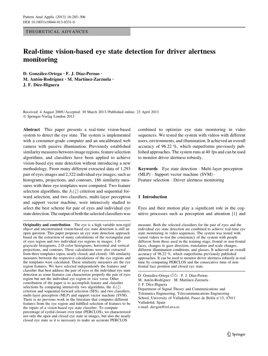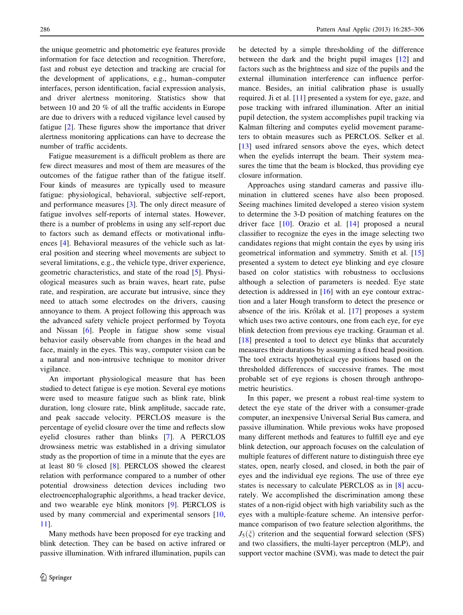 在本文中,我们提出一个可靠的实时系统检测眼睛的司机与一个家用电脑,相机便宜的通用串行总线,被动的照明。 虽然以前的工作提出了许多不同的方法和功能来满足眼睛和眨眼检测,我们的方法主要集中在计算不同性质的多个特性来区分三个州,眼睛打开,几乎关闭,关闭,一双眼睛和个人眼睛区域。 眼三个州的使用是必要的准确计算PERCLOS如[8]。我们完成了歧视在这些州的非刚性的对象具有高变异性等多个功能的眼睛。 一个密集的两种特征选择算法的性能比较,J5enT标准和顺序向前选择(SFS)和两个分类器,多层感知器(MLP),和支持向量机(SVM),检测了一双眼睛和个人独立的眼睛。 我们的司机警觉监控系统使用的输出所选一双眼睛分类器和眼睛选中的个体分类器的输出左眼和右眼的监控视频序列的眼睛状态,这样PERCLOS测量计算。