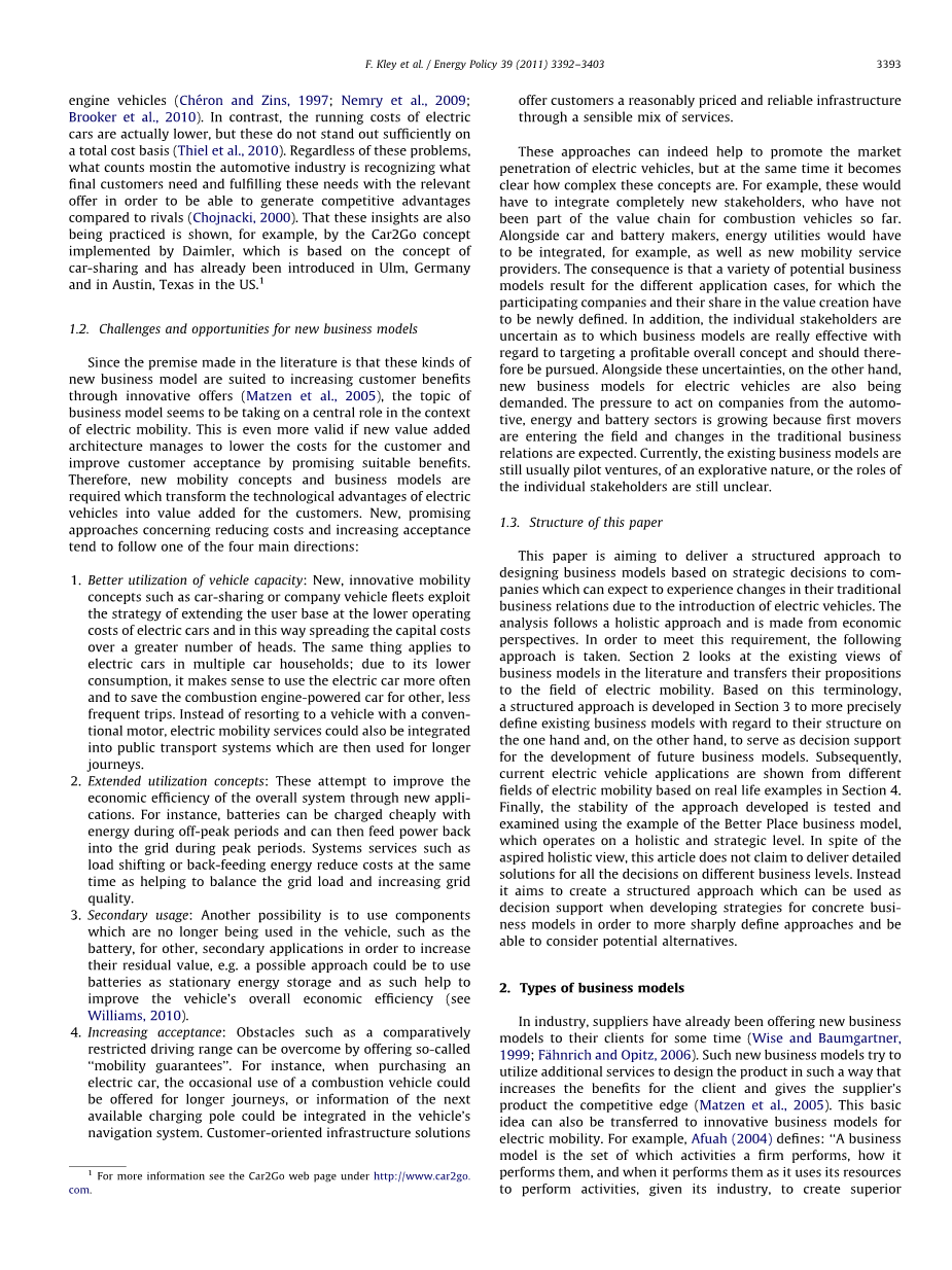 因为在文献的前提是,这些类型的新的商业模式是适合通过创新提供的客户利益(atzen et al., 2005),关于商业模式的话题似乎在电动车中是核心。如果新的价值增值架构管理为客户降低成本,并承诺合适的利益,这是更有效的。因此,新的电动车的概念和商业模式的需将电动汽车的技术优势转化为客户的增值。新的,有前景的方法,关于降低成本和增加接受往往遵循的四个主要方向之一: