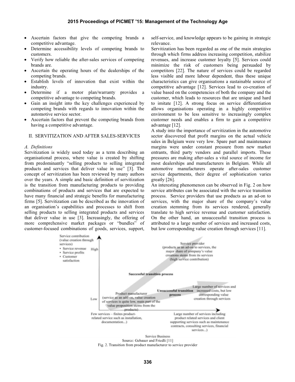 - 第一阶段-大多数制造公司提供销售和支持他们的产品的服务;在某种程度上,他们已经在产品相关服务的市场。然而,这些服务传统上是在组织的不同部分,分散和被认为是不可取的销售产品的必要性。第一步是合并单个组织单元下的现有服务项目。合并过程通常由销售更多产品和改善服务性能的愿望驱动。
