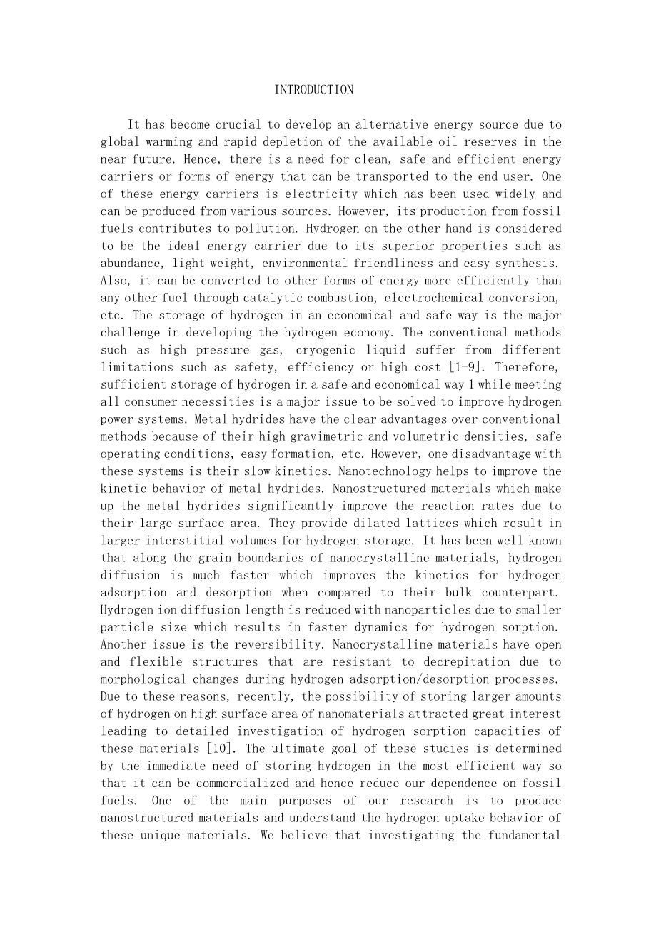 由于全球变暖和在不久的将来可用石油储量的迅速枯竭,开发替代能源变得至关重要。因此,需要清洁,安全和有效的能量载体或能够输送到最终用户的能量形式。这些能量载体之一是已经广泛使用并且可以从各种来源产生的电。然而,它从化石燃料的生产有助于污染。另一方面,氢被认为是理想的能量载体,因为它具有优异的性质,例如丰度,重量轻,环境友好和容易合成。此外,通过催化燃烧,电化学转化等,其可以比任何其它燃料更有效地转化为其他形式的能量。以经济和安全的方式储存氢气是开发氢经济的主要挑战。常规方法如高压气体,低温液体受到不同的限制,如安全性,效率或高成本[1-9]。因此,以满足所有消费者需要的安全和经济的方式1充分储存氢气是要解决的用于改进氢动力系统的主要问题。金属氢化物比常规方法具有明显的优点,因为它们具有高的重量和体积密度,安全的操作条件,容易形成等。然而,这些系统的一个缺点是它们的慢动力学。纳米技术有助于改善金属氢化物的动力学行为。构成金属氢化物的纳米结构材料由于其大的表面积而显着提高反应速率。它们提供膨胀的晶格,其导致用于氢存储的较大的间隙体积。众所周知,沿着纳米晶体材料的晶粒边界,氢扩散快得多,这改善了氢吸附和解吸的动力学(与它们的体对应物相比)。由于较小的粒径,氢离子扩散长度由于纳米粒子而减小,这导致氢吸附的更快的动力学。另一个问题是可逆性。纳米晶体材料具有开放和柔性结构,其能够抵抗由于氢吸附/解吸过程期间的形态变化而引起的爆裂。由于这些原因,近来,在纳米材料的高表面积上存储更大量的氢的可能性吸引了极大的兴趣,导致对这些材料的氢吸附容量的详细研究[10]这些研究的最终目标是立即需要以最有效的方式储存氢气,以便它可以商业化,从而减少我们对化石燃料的依赖。我们研究的主要目的之一是生产纳米结构材料和了解这些独特材料的氢吸收行为。我们相信,调查纳米结构金属2氢化物系统的基本氢吸附性能打开了使用这个系统作为未来氢存储方法的大门。在本研究中,选择氢化钯作为模型系统以确定纳米结构效应,因为其体性质是众所周知的。在制造钯纳米线之前,由于镍的价格高,所以镍被用作测试金属。 使用电化学沉积来生产纳米结构材料。 可以通过电化学沉积工艺来更好地控制制造的材料的尺寸。 在获得纳米结构材料后,通过实验室制备的体积吸收系统研究这些材料的氢吸附性质。 已经通过电化学沉积产生的纳米结构材料的氢吸收的检查是独特的,因为迄今为止进行的氢吸附研究通常应用于通过球磨得到的纳米结构材料。 然而,众所周知,通过高能球磨研磨制备的纳米级材料聚集以降低它们的表面能。 此外,不精确的铣削加料可能导致不希望的测量的不稳定的变化[11-12]。