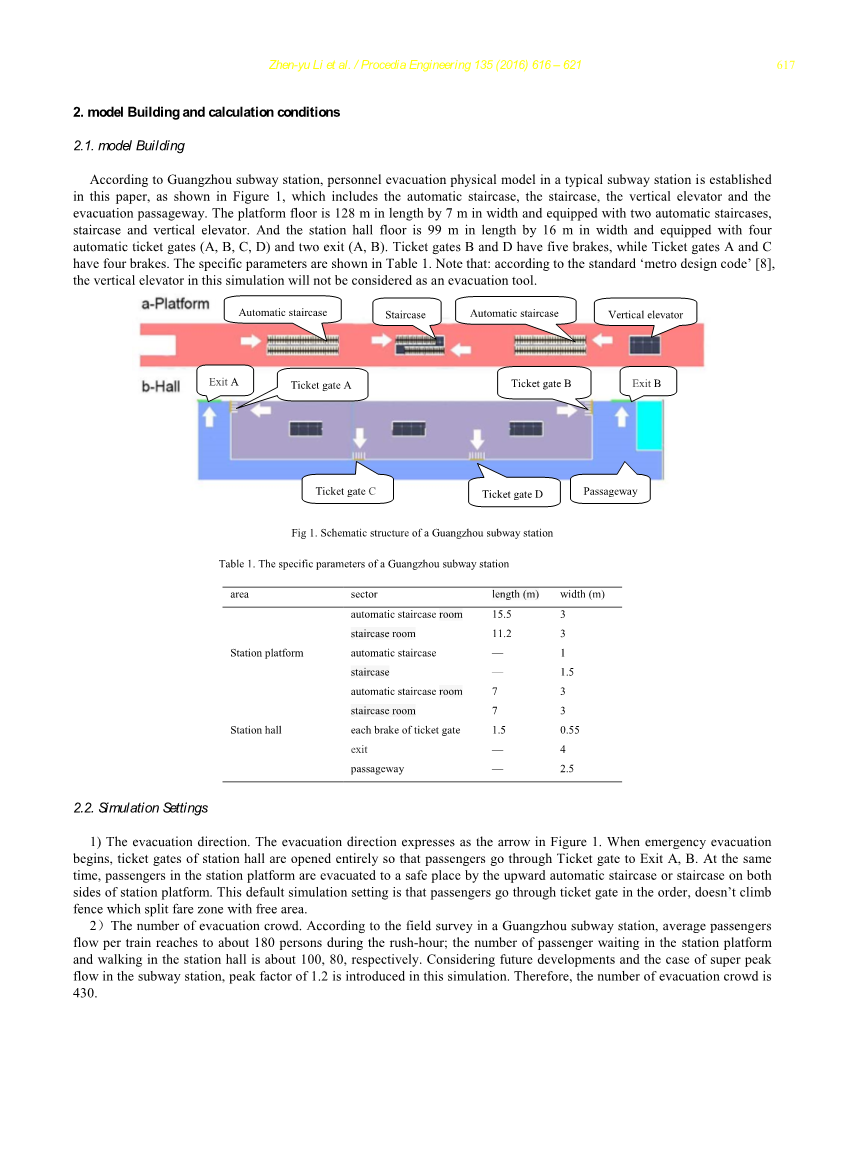 摘要:铁车站作为地下轨道交通系统建设;由于其封闭性和客流大的特点,一旦发生火灾等事故,可能会造成许多伤亡和大量的财产损失。因此,地铁安全疏散不仅是地铁防灾设计的重要内容之一,也是国内外研究领域的公共安全重点和热点问题。本文主要对火灾条件下的人员疏散进行了研究。首先,通过对地铁车站的拍摄和测量,获取地铁客流参数。最后,对安全疏散时间进行了计算。然后根据得到的参数,使用基于Agent技术的Pathfinder仿真软件对人员疏散过程进行仿真分析。结果表明:该站安全疏散时间为3分 8秒。符合《地铁设计规范》要求;楼梯和大门是疏散过程中的出口瓶颈,在地铁疏散设计中有相当大的优化空间。