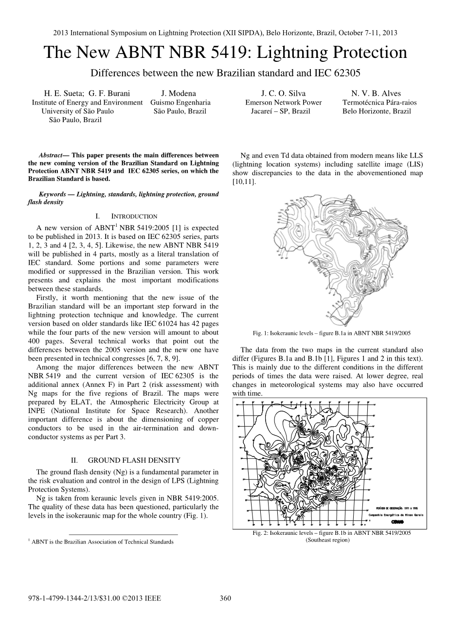 新的ABNT NBR 5419和现行的IEC 62305之间的主要区别之一是第2部分(风险评估)的附录(附录F)中巴西5个地区的Ng图。这些图是由INPE(国家空间研究所)的大气电力小组ELAT提供的。 另一个重要的区别是如第3部分所述的,在接闪器和引下线系统中使用的铜导线的尺寸。