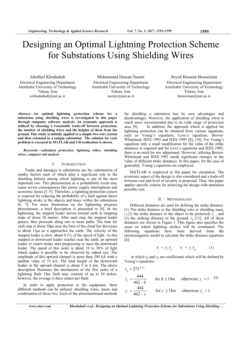 摘要:本文通过计算机软件分析,研究了变电站用屏蔽线的最佳防雷方案。通过在保护、屏蔽线的数量和离地高度之间进行合理的权衡,采用了一种经济的方法。本研究首先应用于一个简单的二线系统,然后扩展到一个样本变电站。在MATLAB中对每个问题进行求解,并给出了三维的实现。