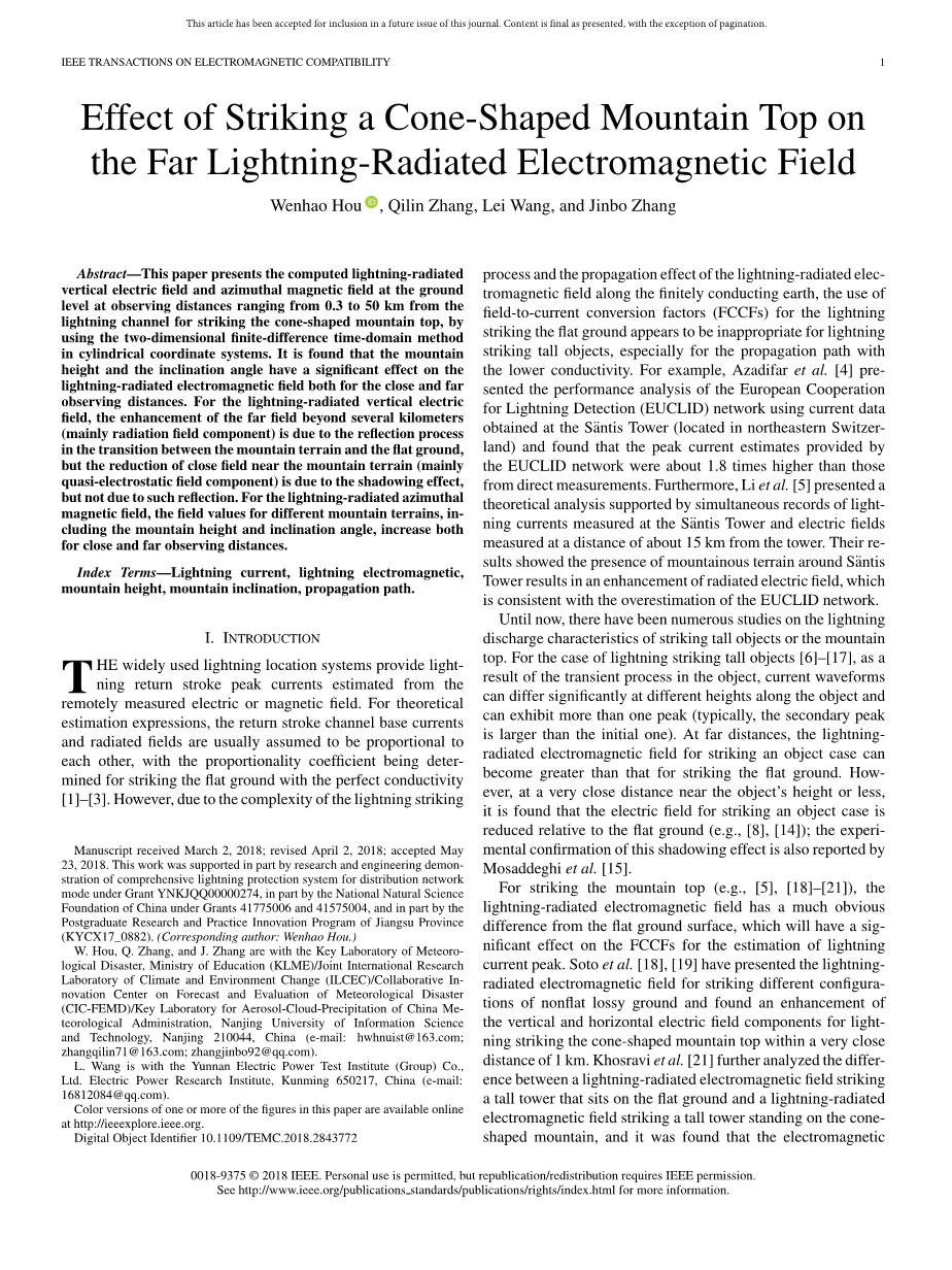 为了击打山顶(例如[5],[18]—[21]),雷电辐射的电磁场与平坦的地面有明显的区别,这将对FCCFs产生显着的影响。雷电流峰值的估计。索托等人[18],[19]提出了闪电辐射的电磁场,用于打击不平坦有损地面的不同配置,并发现了一个增强的垂直和水平电场分量,用于照射锥形山顶。距离非常近1公里。Khosravi等人[21]进一步分析了闪电辐射的电磁场撞击位于平坦地面上的高塔和闪电辐射的电磁场撞击位于锥形山上的高塔之间的差异,并且发现与塔架在平坦地面上的情况相比,用于撞击锥形地面上的塔架的电磁场具有增强性。此外,山锥角和高度以及塔高对沿塔,闪电通道及其相应电磁场的电流分布有影响。