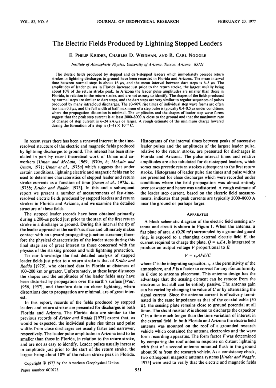 近年来,人们对于时变电磁场的波形有了新的兴趣,这一兴趣由Uman[Uman和McLain,1969,1970a,b; McLain and Uman, 1971; Uman,1971; Uman 等., 1975a]等人的理论工作激发出来。这一理论表明,在一定情况下,电场和磁场都可作为时间函数[Uman等人,1973a,1975b; Krider and Radda, 1975]. 来确定梯级先导和回击的特征。在这一系列报告中,我们展现了一些对佛罗里达和亚利桑那的梯级先导和回击过程块电场测量的数据,并且我们详细检查了这些区域的电场结构。
